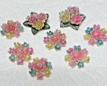 - 8 Vintage Celluloid Flower Decorations Pastels 2 Sew On 3/4" 6 Glue On 5/8"