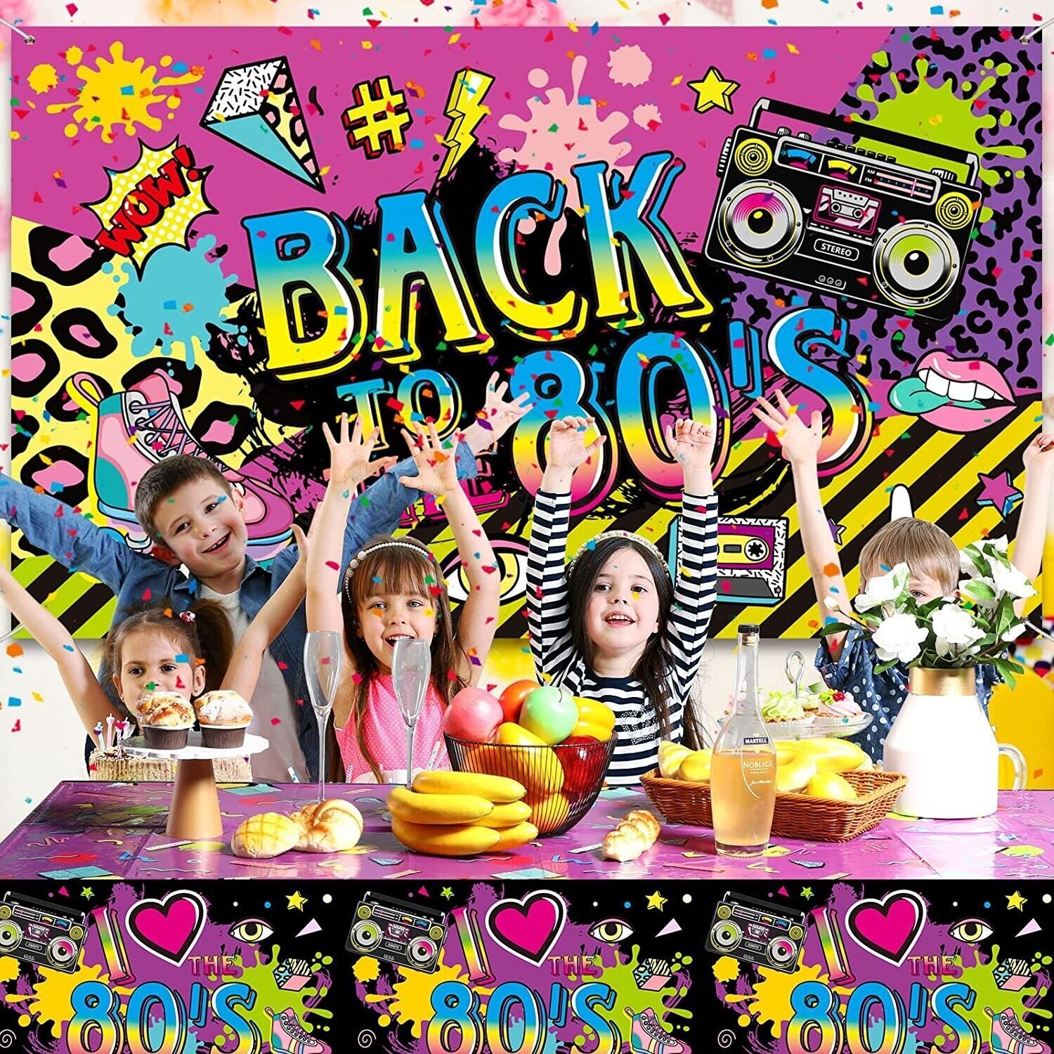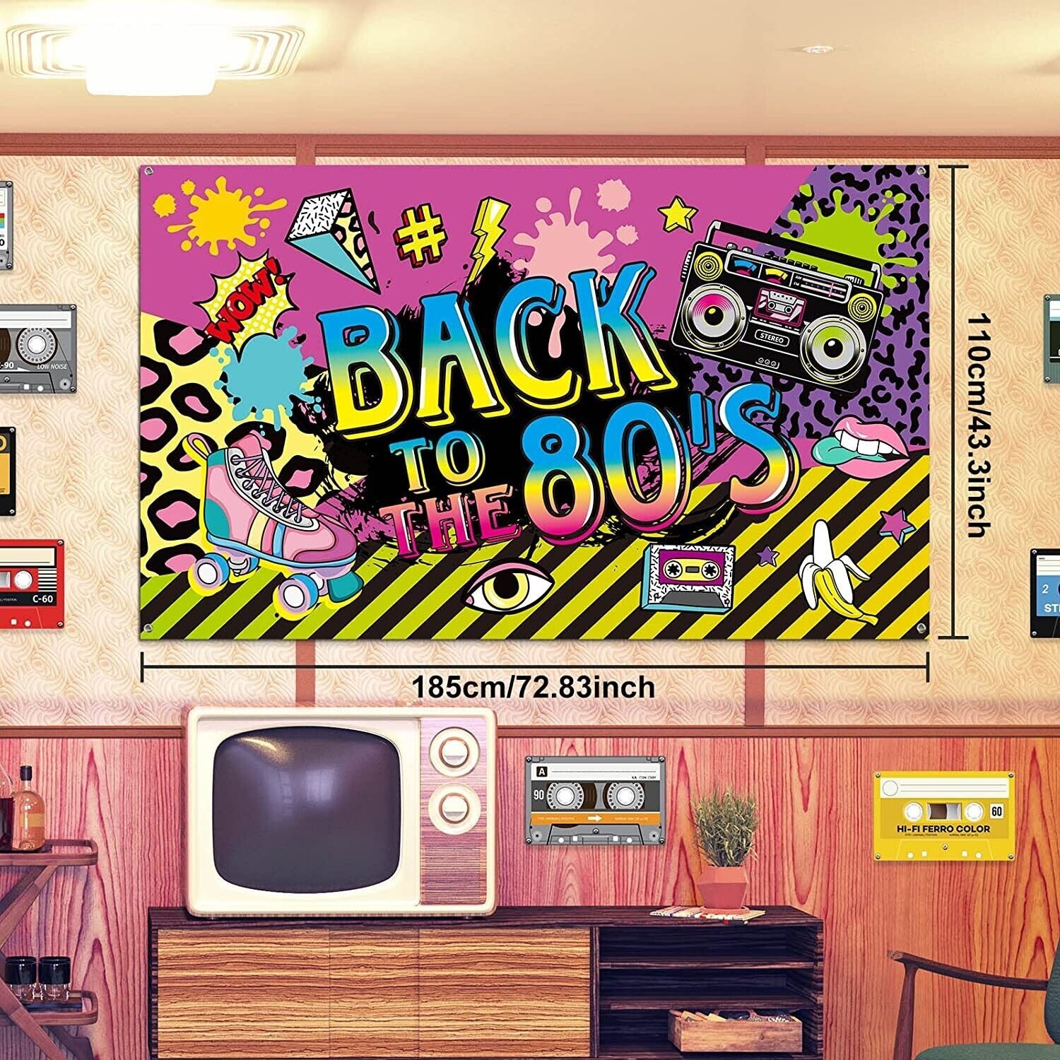 Chic design: this 80s party decoration features a retro 80's design with neon elements, fun geometric prints and colorful text that reads "Back To THE 80's", creating a coordinated theme for 80th birthdays, theme nights and school dances