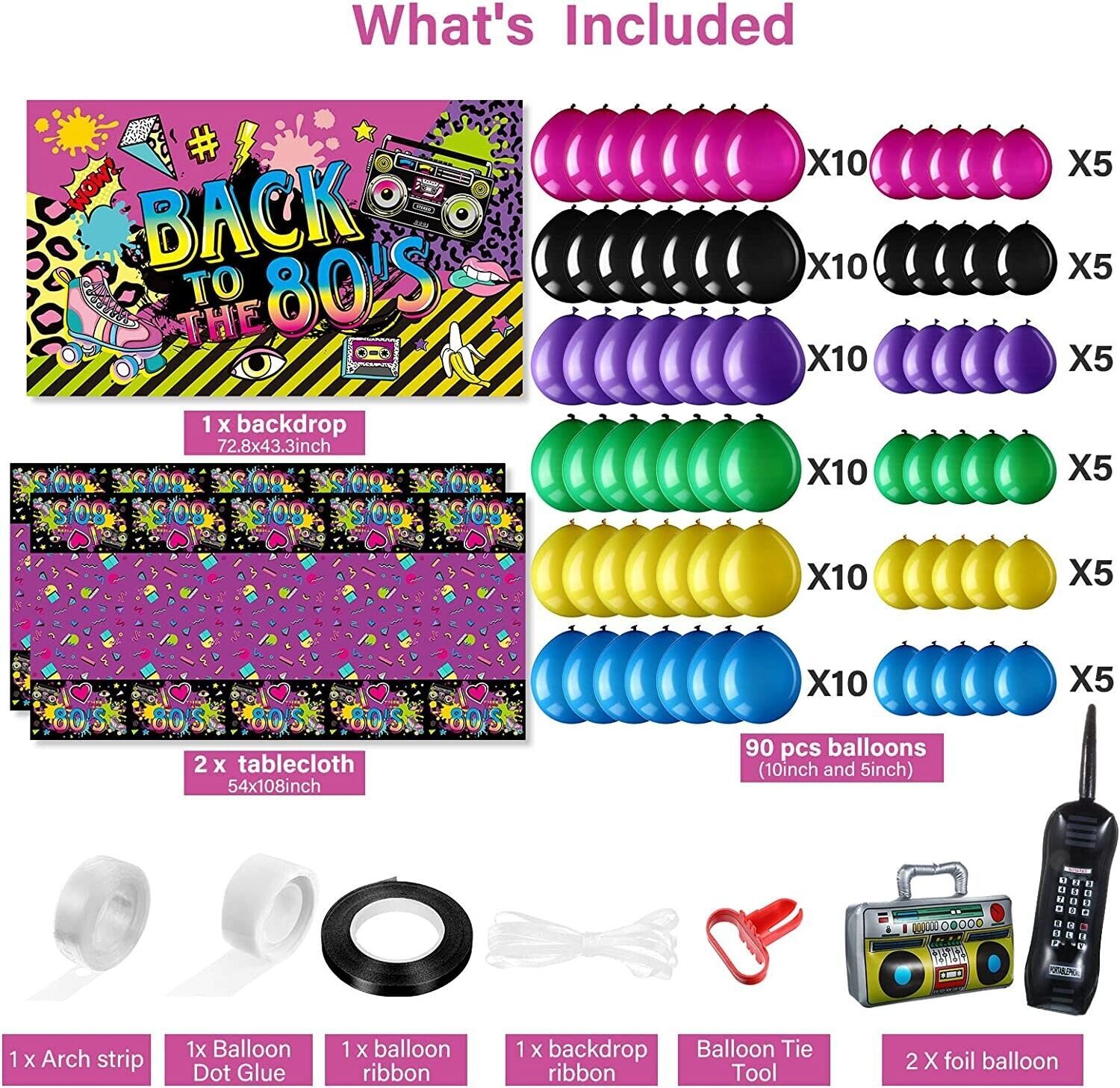 What's included: this party supplies set includes 2 pieces of 54 x 108 inches table cover, 43.3 x 72.8 inch backdrop, inflatable radio boombox and mobile phone, 95 pieces balloons of different color, dispensing, balloon chain, black ribbon and balloon knotter, we are provide 2 styles for you to choose, 80s and 90s