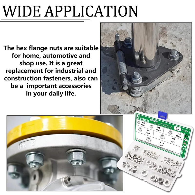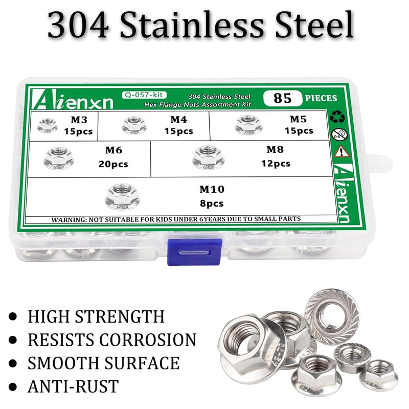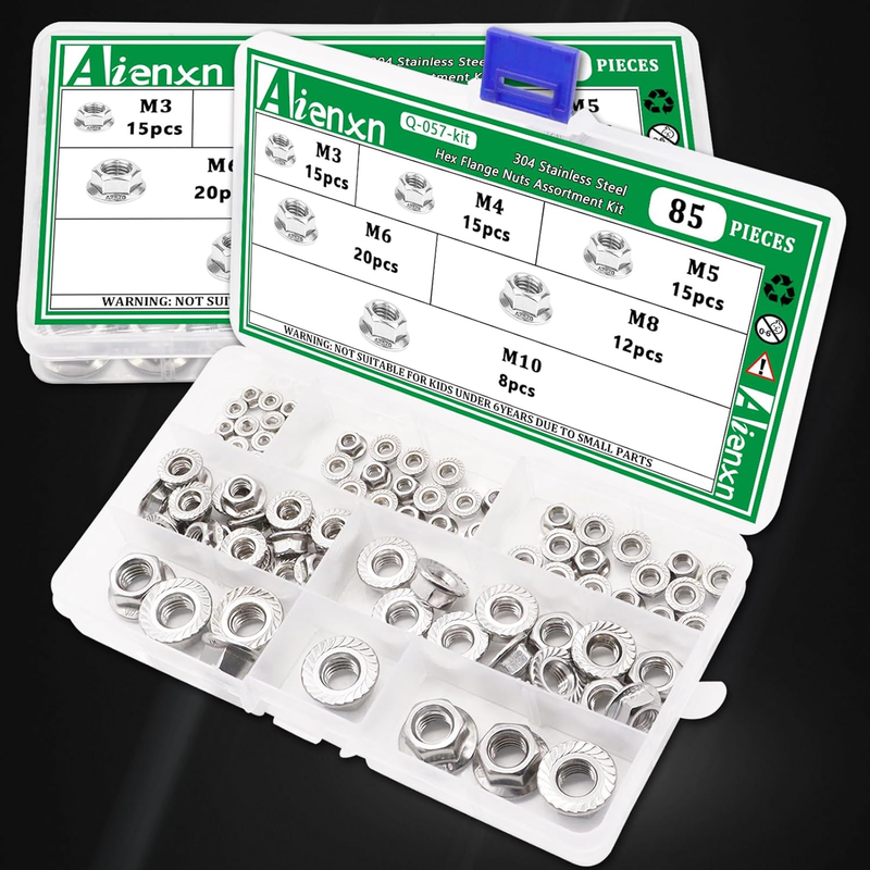 - 85PCS 304 Stainless Steel Hex Flange Nuts Assortment Kit - M3 to M10