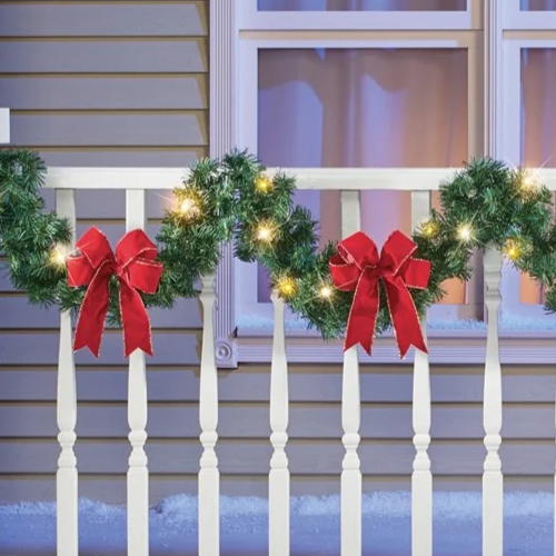 - 9-Ft LED Lighted Christmas Garland with Red Bows Indoor Outdoor Holiday Decor