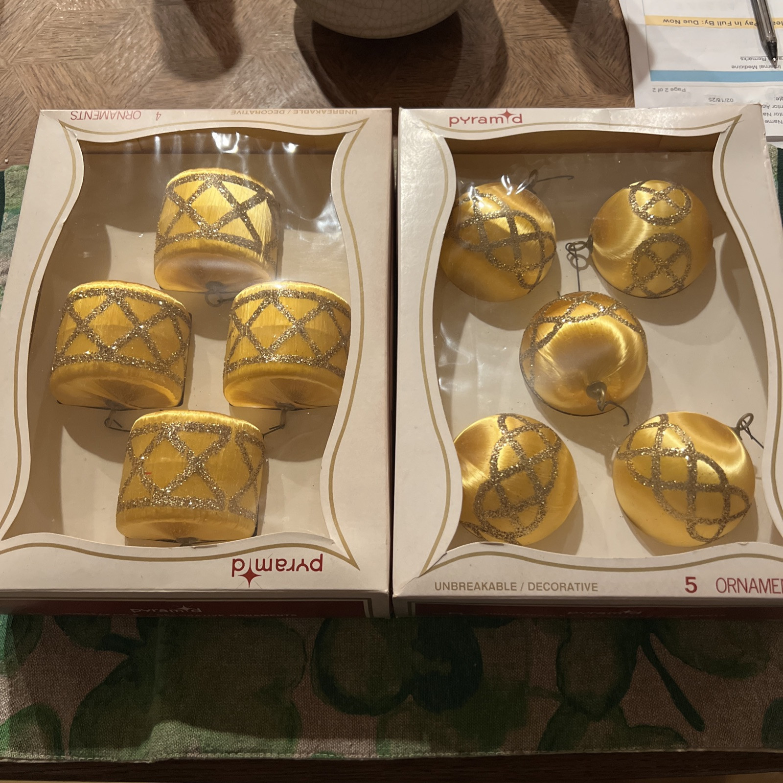 9 Pyramid Satin Sheen Christmas Ornaments Gold Glitter Drum Sphere Both