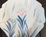 This 9" porcelain plate features a floral pattern of iris mist in a multicolor design. It is hand-painted and handmade, giving it a vintage feel. The plate is round in shape and serves as a decorative piece for all occasions. The brand is unmarked, and it is an original piece with antique qualities.