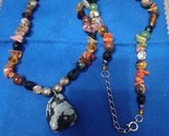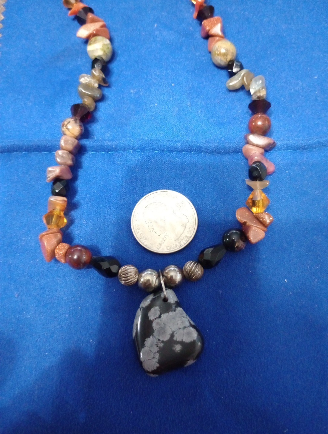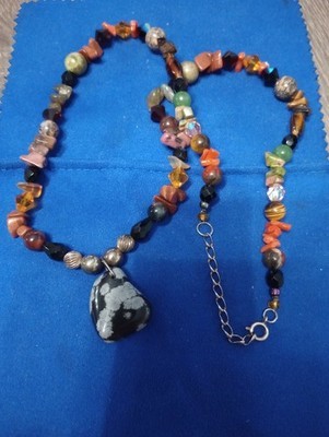 Sterling silver latch and beads as well as multiple mixed gemstones with a primary pendant of snowflake obsidian