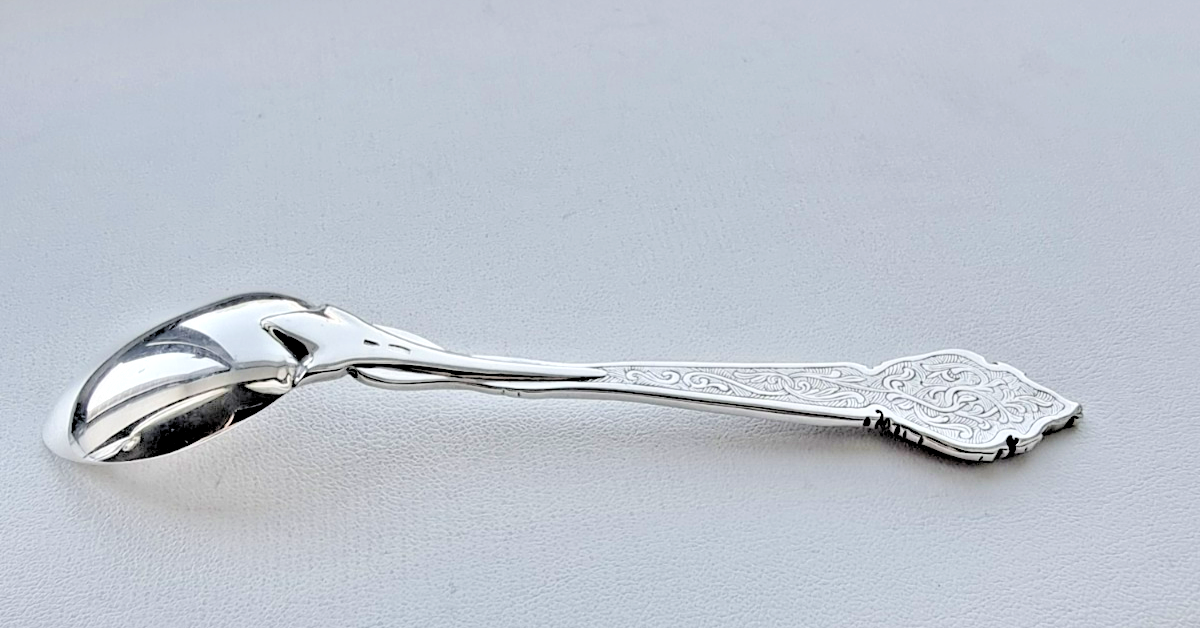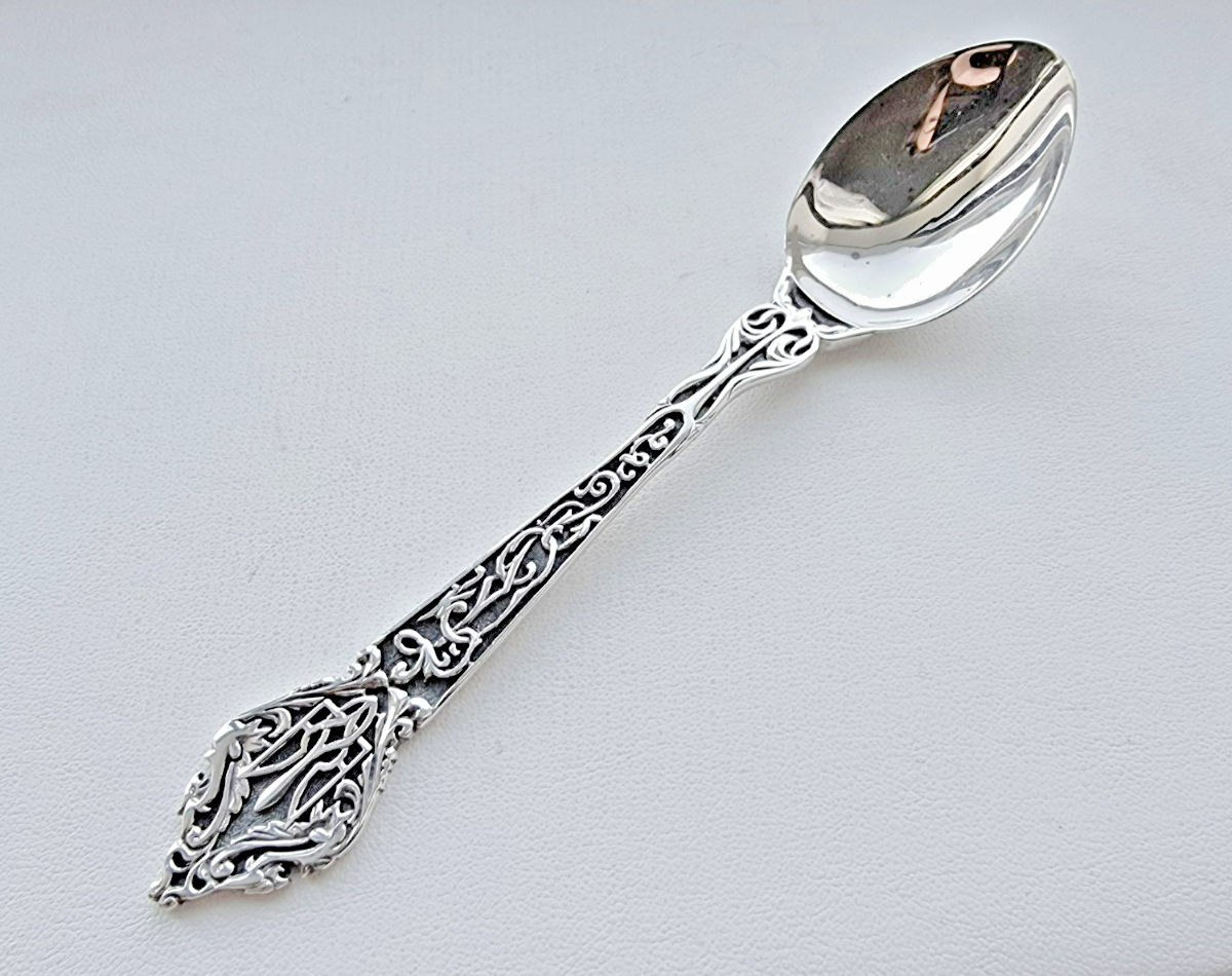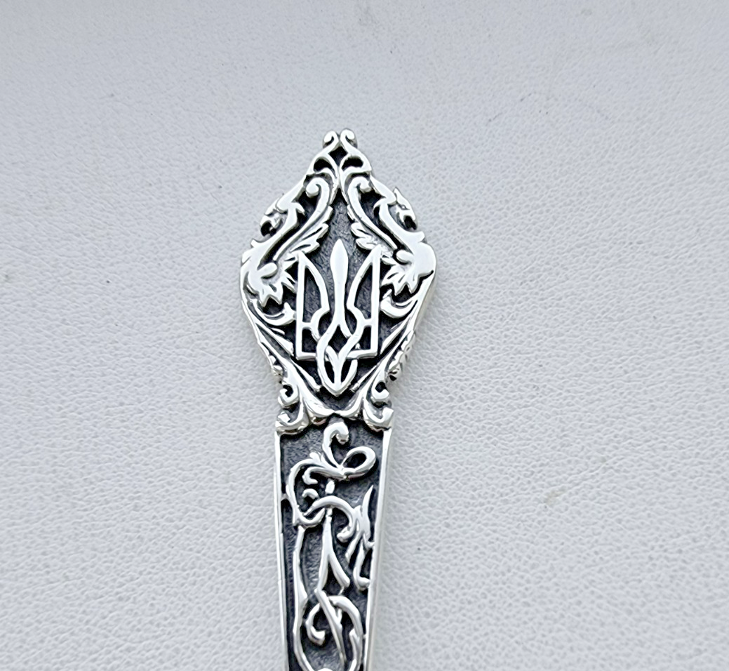 This product is a 6.75 inch sterling silver collectible spoon featuring the coat of arms of Ukraine. The mid-century modern design makes it a unique and stylish addition to any silverware collection. Made in Ukraine by the brand X?2, this souvenir spoon is a special piece that showcases both historical significance and intricate craftsmanship.