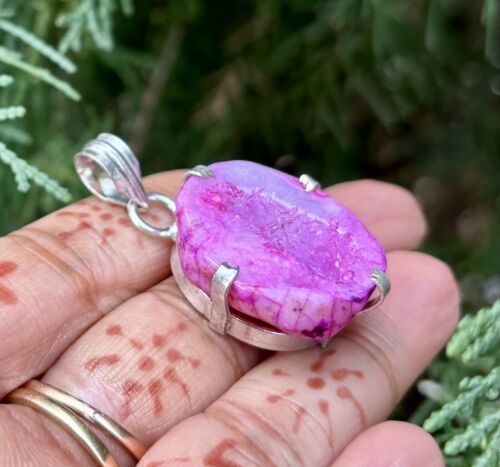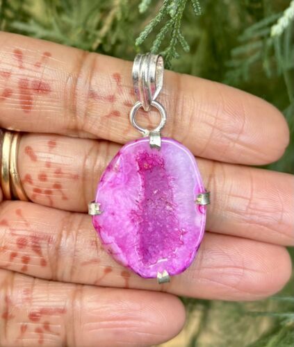 - 925 Sterling Silver Plated, PINK Druzy Geode Agate Stone Pendant, Healing 15
