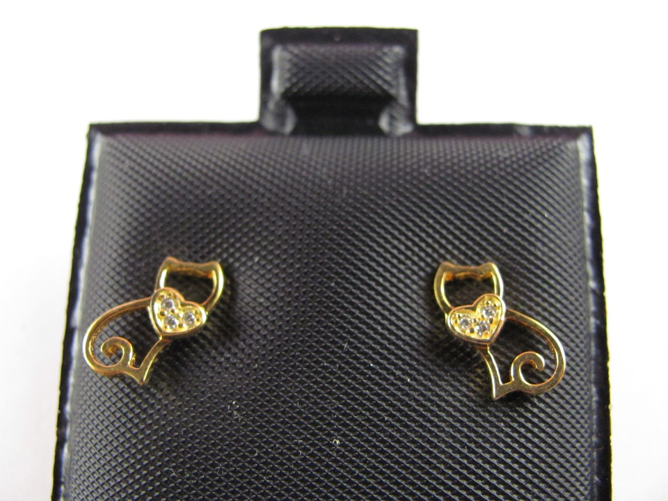 - 925 STERLING SILVER stamped EARRINGS CAT - with glitter stone gold colored