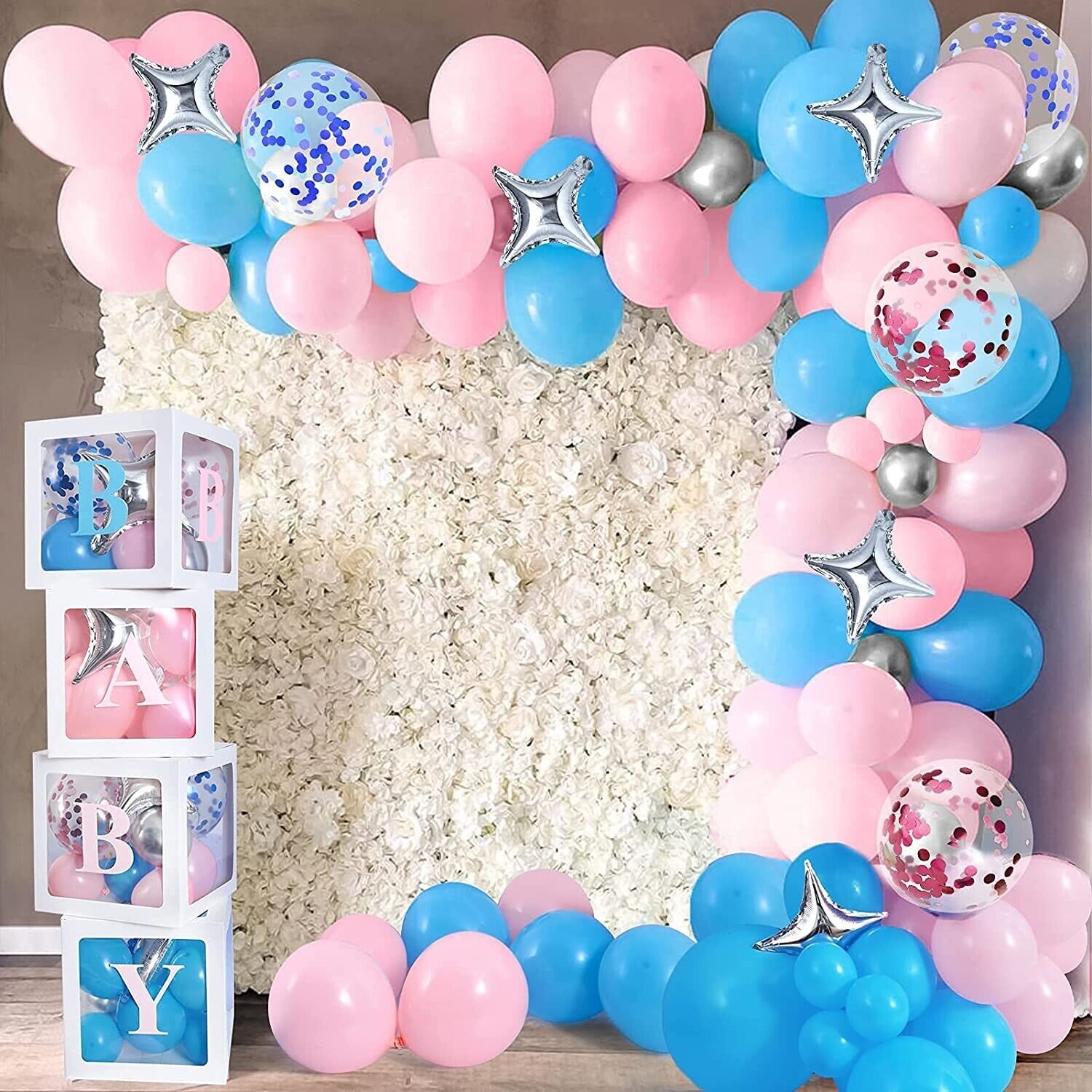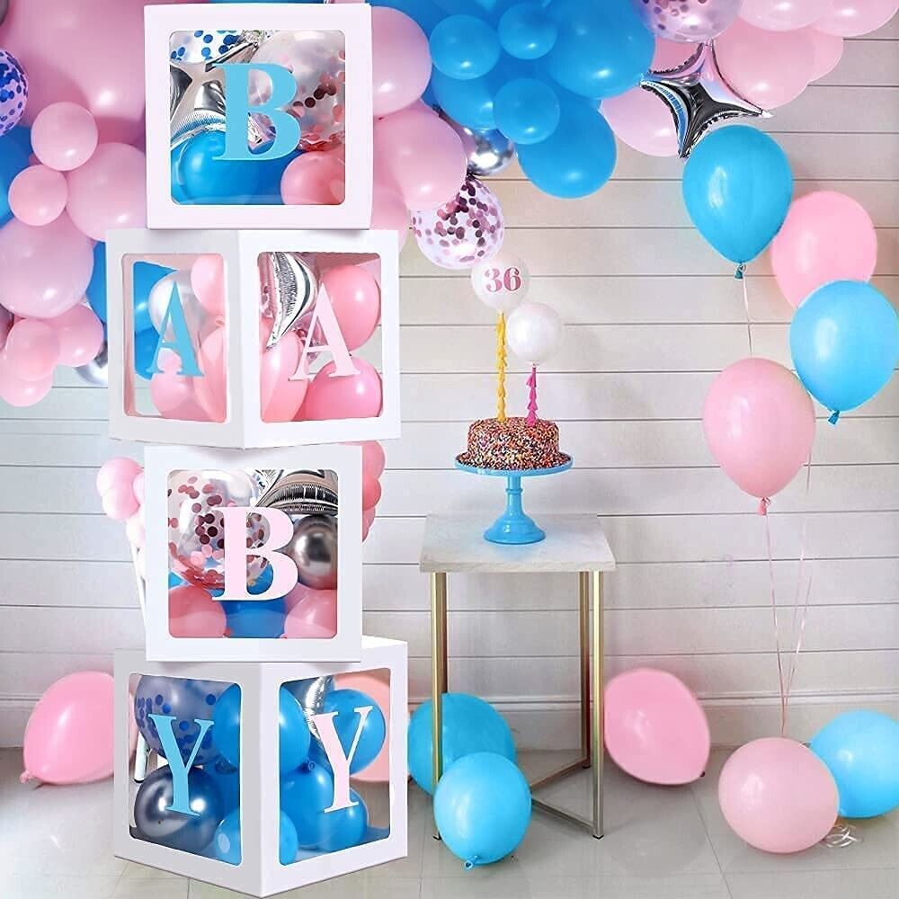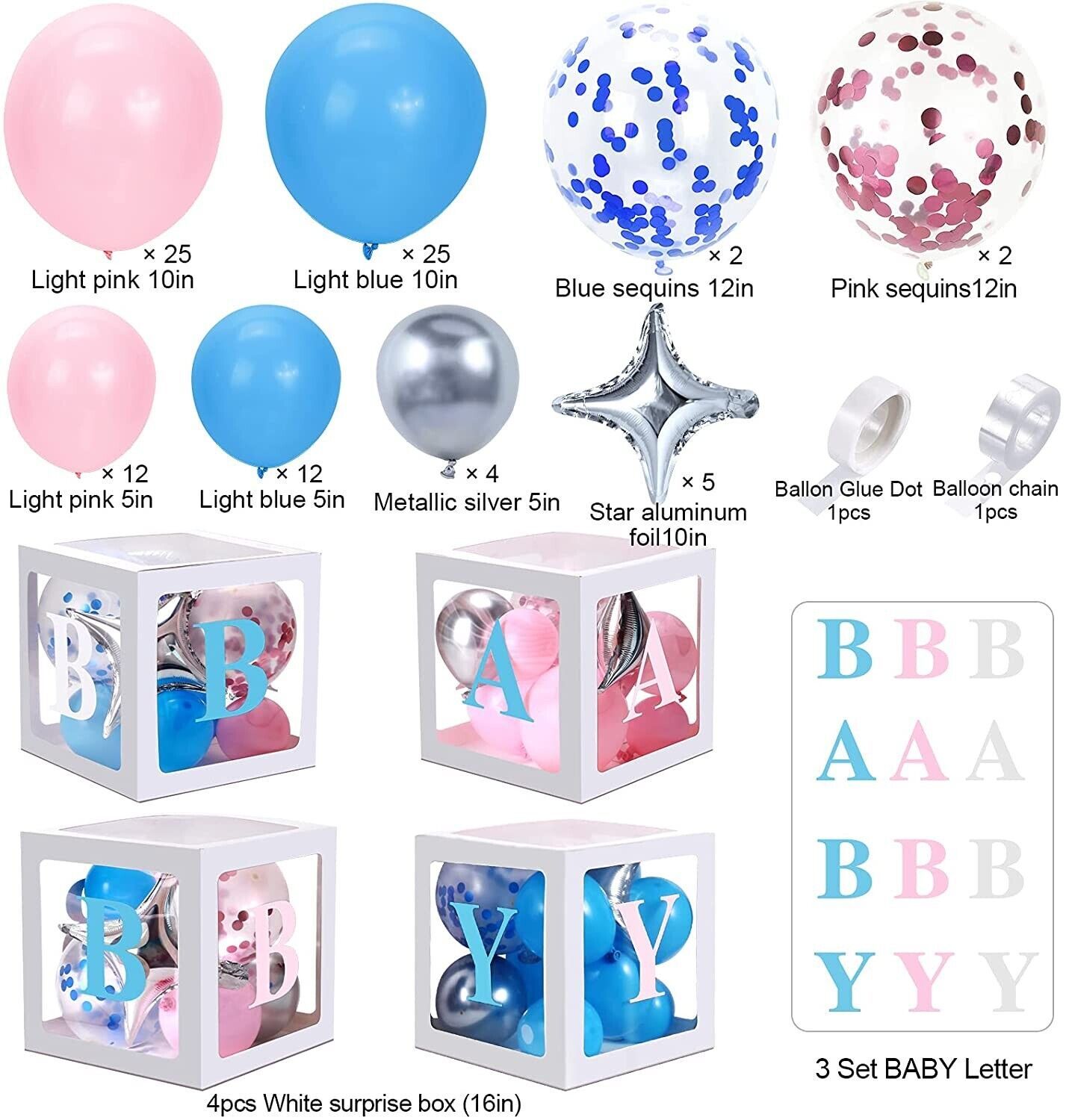 Multi-Function - A variety of bright colorful balloons and 4 sets baby boxes with Letters are very suitable for gender reveal party decorations. They can also be used as baby theme baby shower kid birthday party decoration, perfect backdrops and props for your photos which make your party more festive.