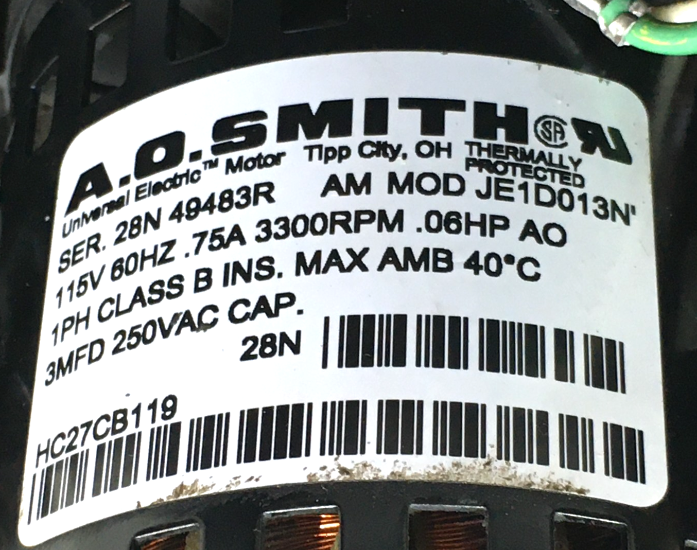 This is A.O. SMITH JE1D013N Draft Inducer Blower HC27CB119 3300 RPM 115V .06HP 60Hz used part.