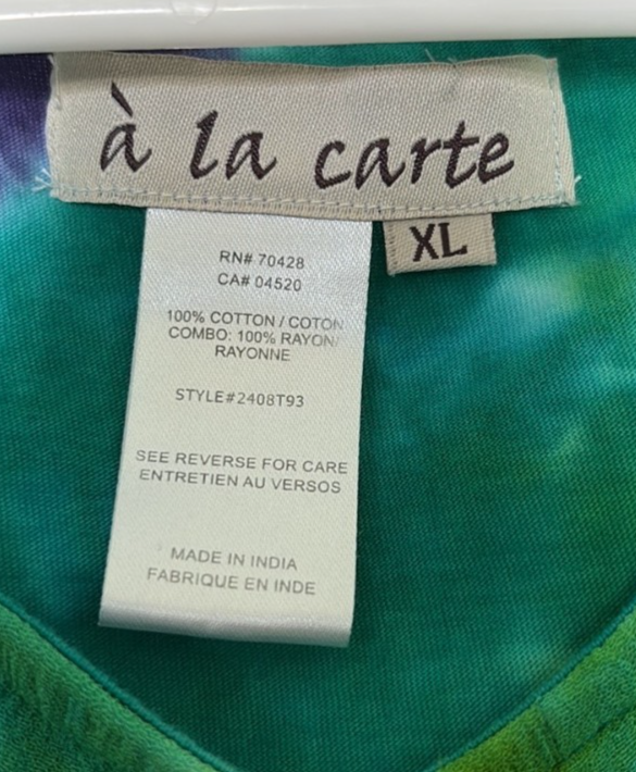 A la Carte Women's Tie-Dye Top - Green, Blue, Purple Size XL. Embrace vibrant style with the Women's Tie-Dye Top. Featuring a stunning blend of green, blue, and purple, this top adds a splash of color to any wardrobe. Perfect for casual outings or a day at the beach. Armpit to armpit measures 24?. Shoulder to hem is 24?. 100% Cotton and Machine Washable. Very Good Used Condition - See photos for further description.