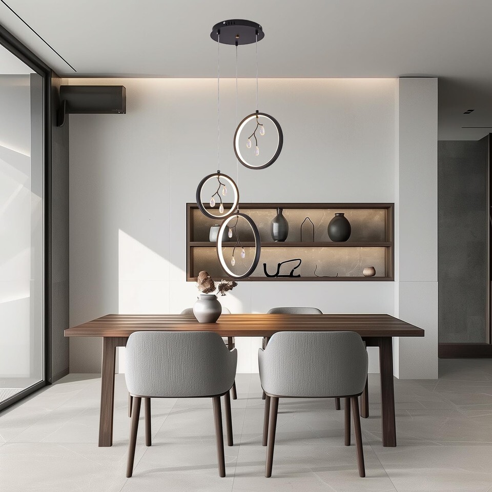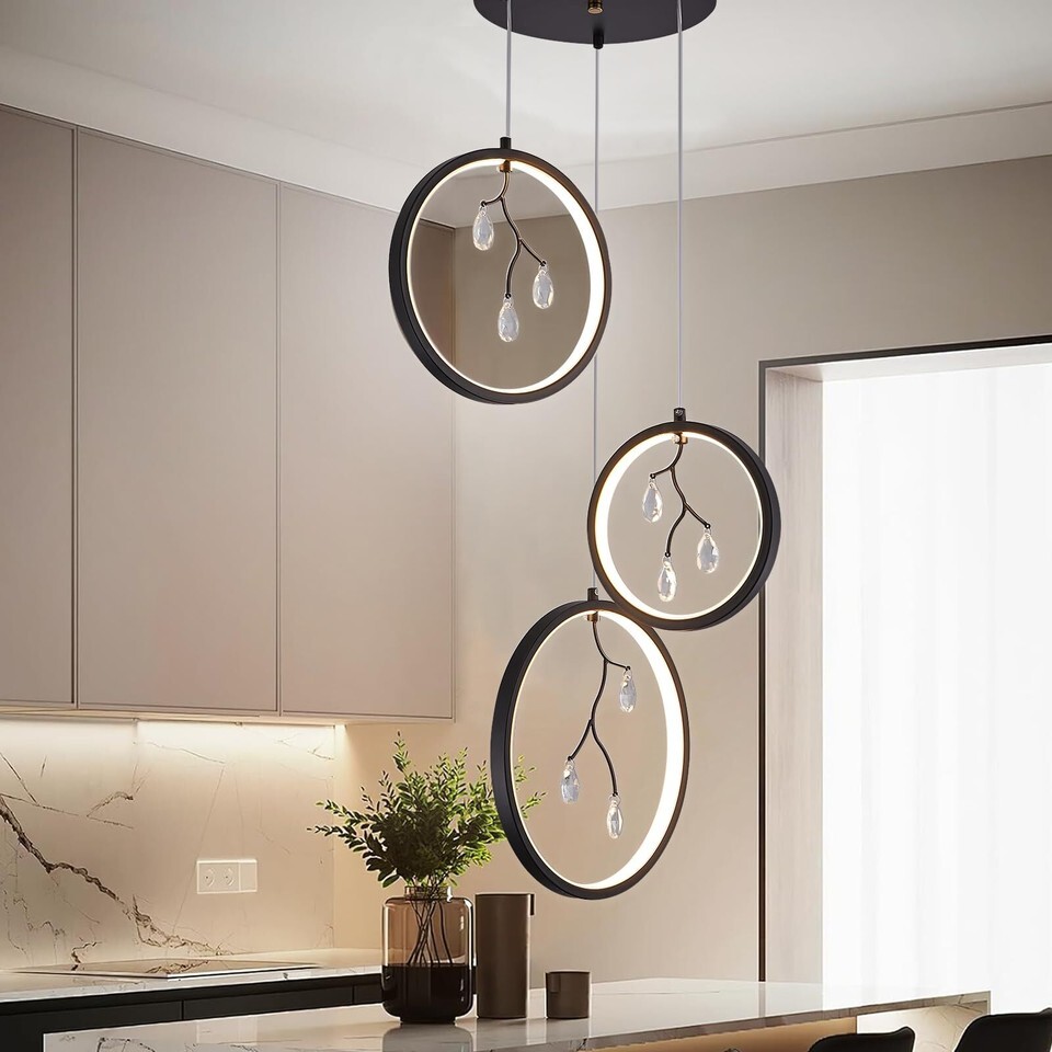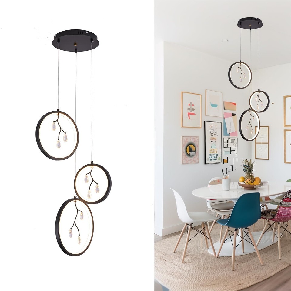 Aesthetically Designed Structure ACNENZIO modern black chandelier consists of three rings (11.8/9.8/7.8"), freely adjustable (15-90), suspended in a golden ratio, with a matte black ring, each ring with 3 crystals, cut with a meteorite impact texture, in the shape of a branch of light, new life and brightness.