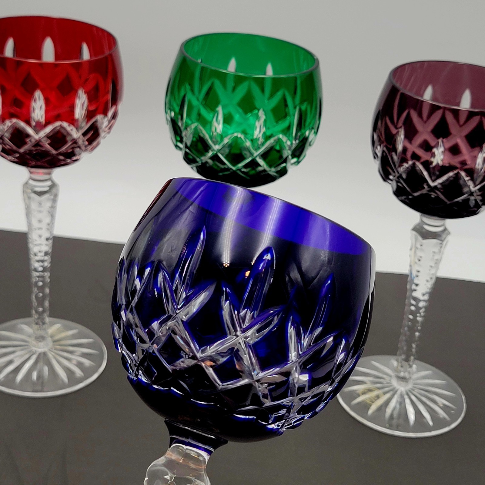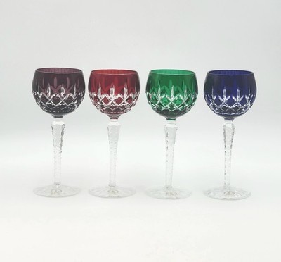 The AJKA Crystal Cut to Clear Arabella 8.5? Stemmed Wine Glasses Set of 4 is a vintage collection featuring a multicolor design with a hand-blown crystal material. Made in Hungary during the 1970s, these stemmed wine glasses are perfect for all occasions and bear the original production style of cut glass.