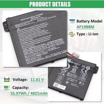 The AP19B8M Battery is a high-quality laptop battery designed specifically for Acer TravelMate P4 TMP414-51 and Acer Swift 3 SF314-59 models. With a battery capacity of 4821mAh and a voltage of 11.61V, this Li-Ion battery provides reliable power for extended use. The sleek black design complements the overall look of the laptop, while the three battery cells ensure long-lasting performance. Made in China, this battery is compatible with Acer TravelMate models and is a perfect replacement for maintaining your laptop's functionality on the go.