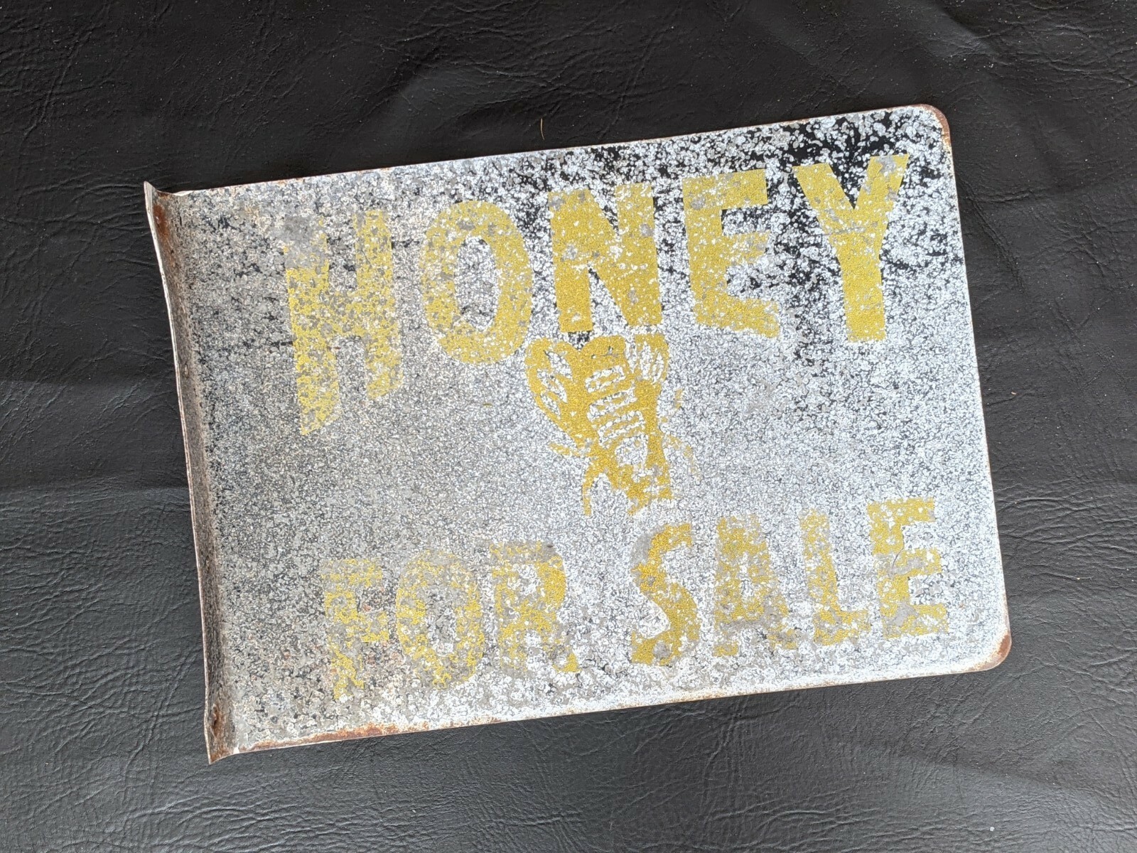 A vendre est un temps altere Aafa Antique Metal Honey a vendre Friaded Double face 1940 Salvage. Signe honnete original. Mesure 16,5 "de long x 12" de haut. Patine d'origine avec aucune modification.