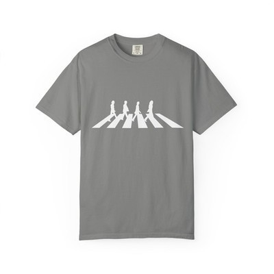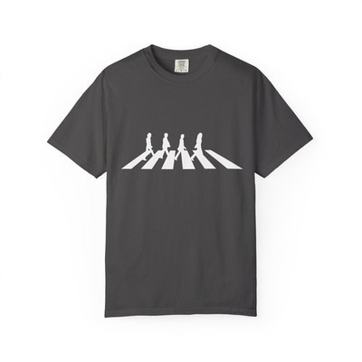 A classic unisex garment-dyed t-shirt featuring a design inspired by Abbey Road. This t-shirt gives off a retro and nostalgic vibe, perfect for music lovers and fans of the iconic album. It is relevant for music-themed parties, concerts, and casual everyday wear.