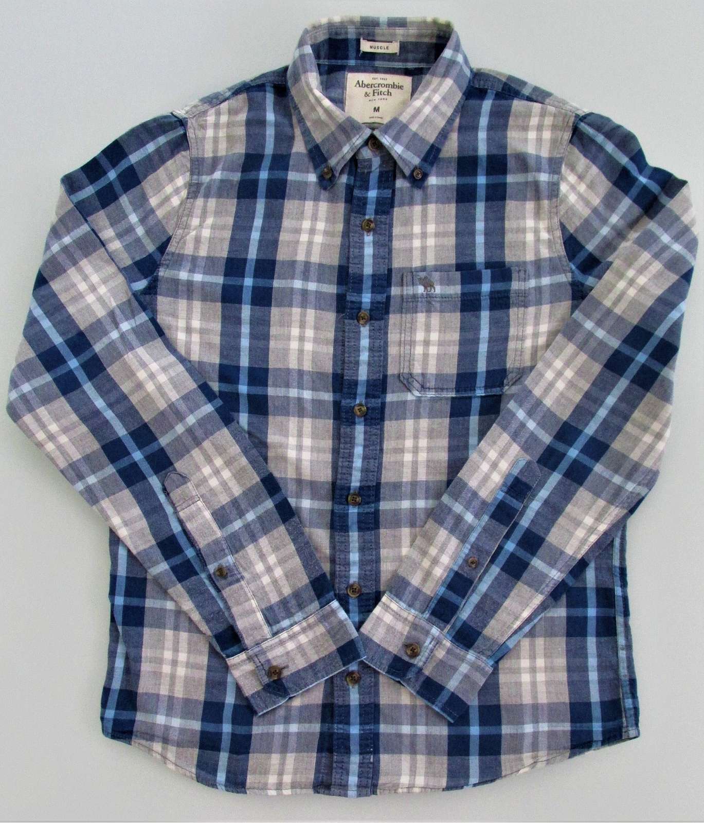 Description: Up for sale is an Abercrombie Fitch men's long sleeve cotton shirt. The size is medium (muscle-fit). It is made of 100% cotton fabric. This shirt has a multicolored plaid pattern in white, blue gray. The shirt has a full button front cuffs with 1 breast pocket. This shirt is in excellent condition.