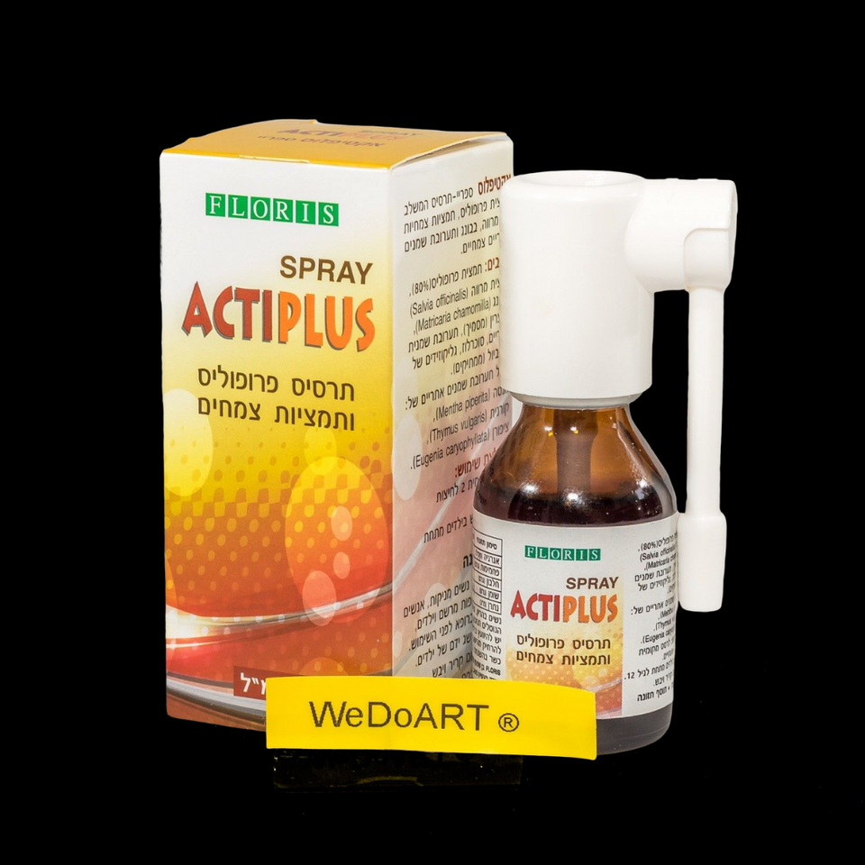Actiplus spray is composed of liquid extract and Propolis: Floris Standardized Dry Extract and four medicinal plants: common sage, thyme bush, coronation tree and camomile, for throat disinfection and relief.