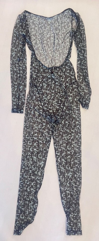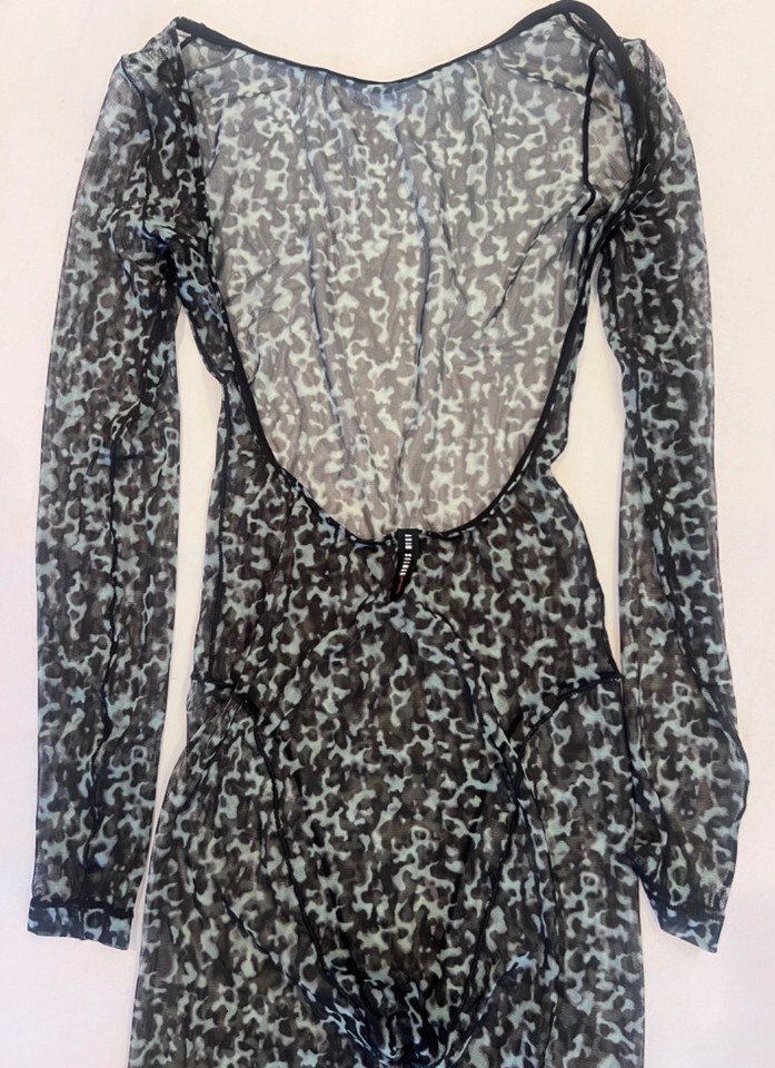 This is a great Adam Selman Sport bodysuit/catsuit. Unproduced one of a kind sample item! Black and teal animal print mesh stretch bodysuit is COMPLETELY SEE THROUGH. French cut seaming, low cut open back and black ASS logo on back. Brand new WITHOUT tags because it is a sample piece. NO SIZE TAG - recommend XS or XXS, and all Selman samples were made in XS. Very tight fit.