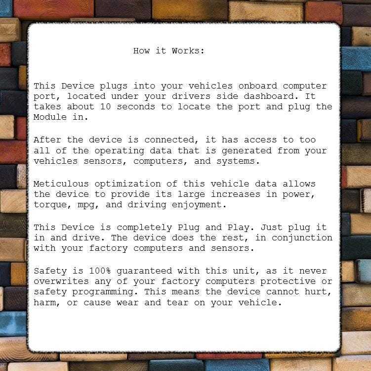 the device, just unplug it. No mechanical experience is needed to install, use, or remove The Rytovik High Performance Tuner Tuning Chip.