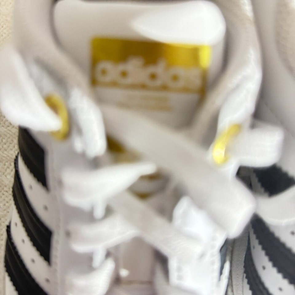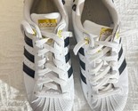 Women's Adidas Superstar sneakers in classic white with black stripes and gold detailing. Features a unique animal print accent on the heel and gold Adidas branding on the tongue and side. These iconic shell-toe shoes combine retro street style with modern flair. Gently worn with some insole fading but lots of life left.