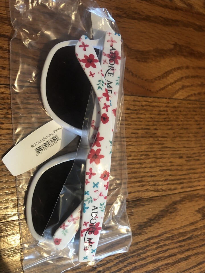 The product is a pair of Adore Me sunglasses with a colorful floral accent pattern in red, green, and blue. The frame color is multicolor with blue lenses. These stylish sunglasses are brand new and come with their original tags, making them a fashionable accessory for any outfit. The floral pattern adds a touch of nature to the design, making them a trendy choice for women looking to add a pop of color to their look.