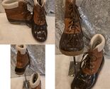#1006...."Adriana"....duck boots, featuring a waterproof rubber or plastic lower section and a leather or synthetic upper. They have laces for closure and a soft, warm lining, likely made of faux fur or shearling, extending to the collar. The color scheme consists of a dark brown, glossy lower part and a lighter brown upper, with the lining being off-white. The sole appears to be made of rubber with a textured grip. Duck boots are designed for wet and cold conditions, providing both water resistance and insulation......Size 8....