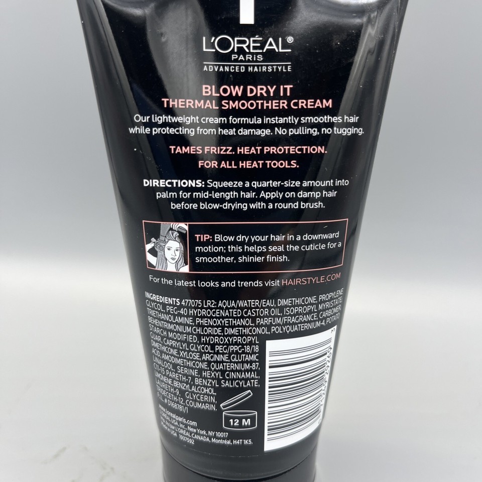 L'Oreal Paris Blow Dry It Thermal Smoother Cream Tames Frizz Heat Protection 5.1 fl oz. See pictures for details.