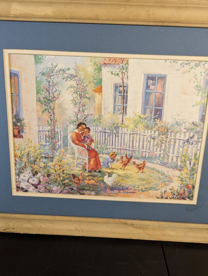 The African American art print titled "Mom with Child in a Garden" by Eugene La Foret is a large, framed painting created in the contemporary period. This licensed reproduction showcases a beautiful and emotive scene of a mother and child in a garden, with the artist's signature adding authenticity to the piece. Handmade in Mexico, this unique artwork depicts a timeless and heartfelt theme, making it a standout addition to any art collection.