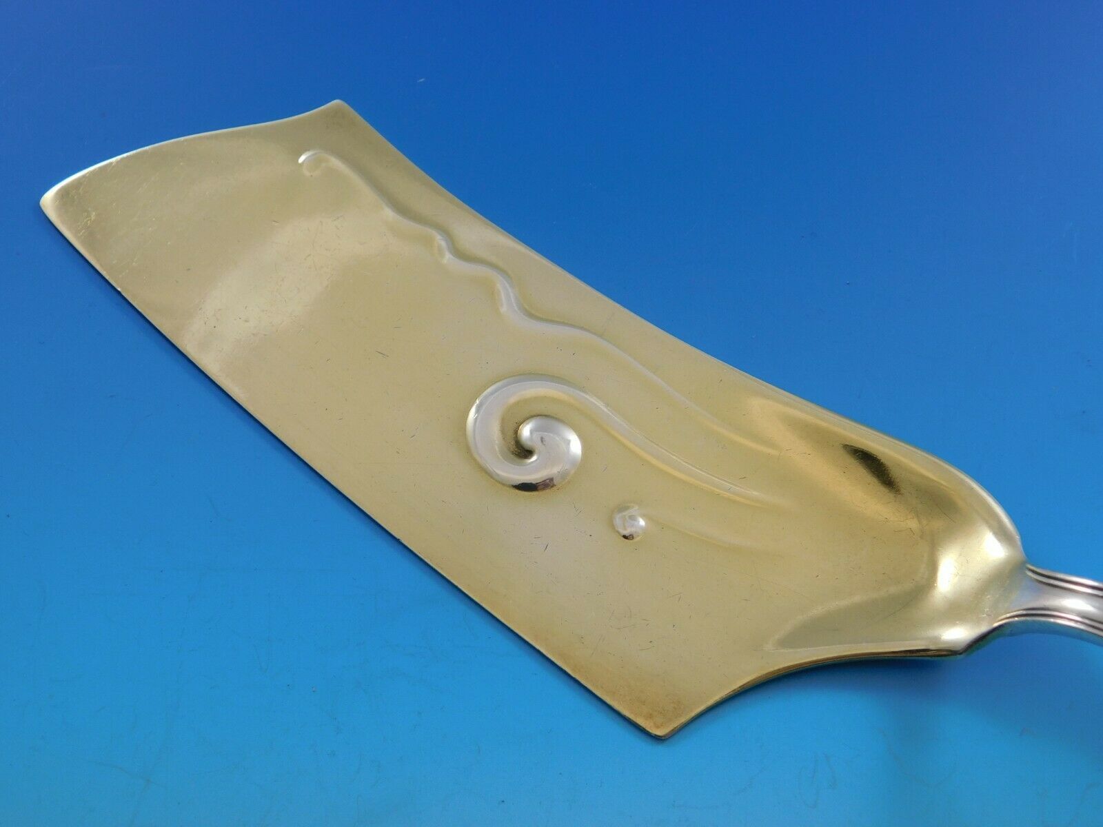 Sterling silver Ice Cream Slice goldwashed blade 12" featured in Tiffany Flatware Book By Hood, William, ET AL Page 131 Figure 187 in the pattern Ailanthus By Tiffany Co.. It is not monogrammed and is in excellent condition.