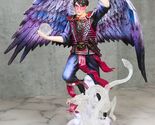 ? Summoning the forces of the air, the wizard in this figurine raises one hand while balancing a transparent sphere in the other. The intricate outfit, reminiscent of a samurai, is adorned with rich colors and armor, and feathered wings in shades of purple and indigo spread out to either side. Perched atop a cloud, the sorcerer is joined by a magnificent air dragon with gleaming white scales and an open mouth, poised for battle.