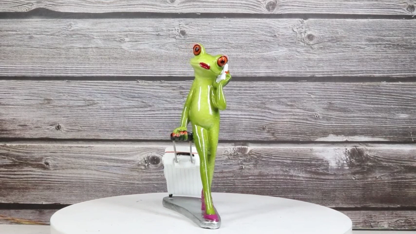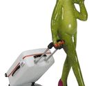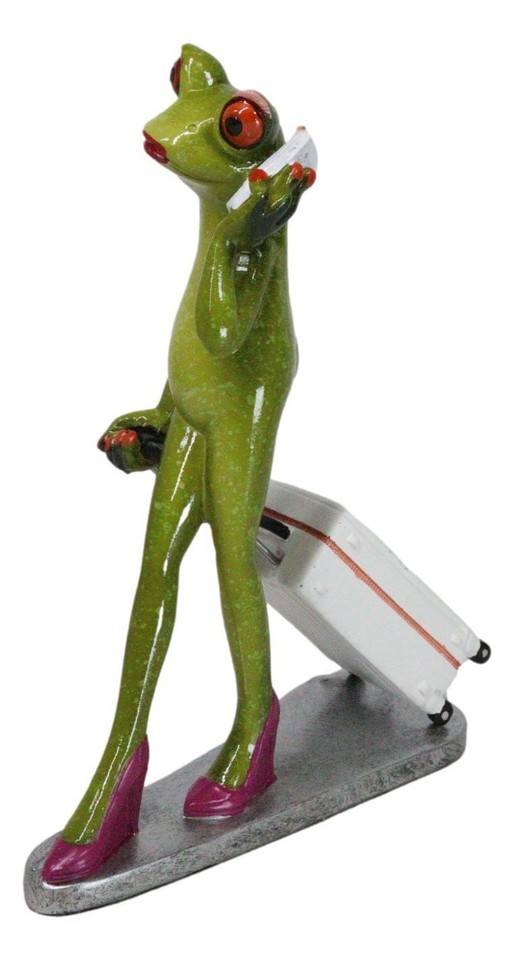 ? Introduce a playful touch of modernity to your decor with our Sky Miles Traveler Lady Frog Figurine. This chic frog is prepped to impress, sporting red heels, bold lipstick, and clutching a cell phone, all while pulling a stylish carry-on suitcase. The vibrant details and contemporary accessories capture the essence of a busy, fashionable traveler. Perfect for adding a touch of whimsy to your office, living room, or travel-themed decor.