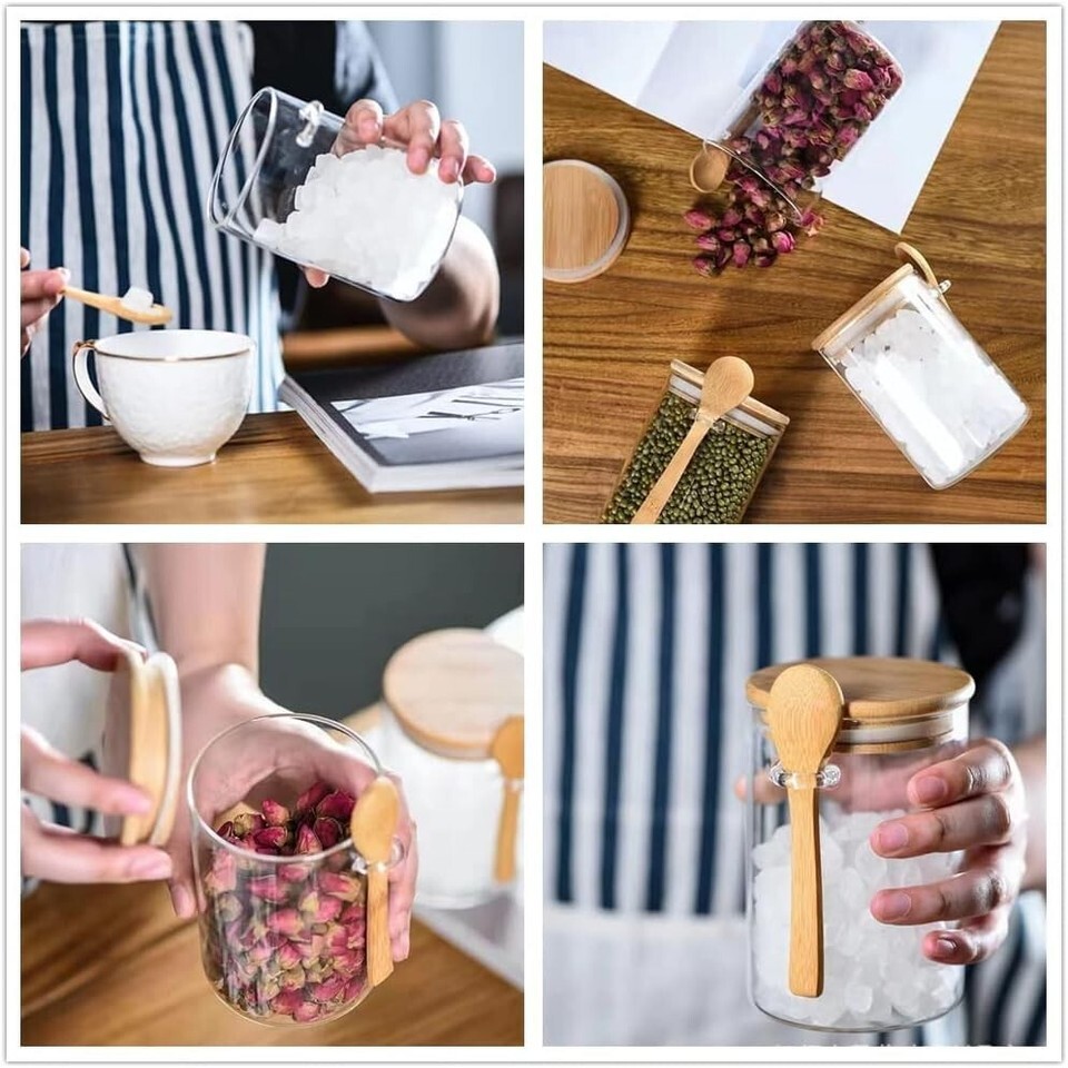 Quality Material Information:Our glass jar made of high-grade borosilicate glass, exquisite craftsmanship, high temperature resistance, tight texture , makes more thinner, lighter, capable of withstanding thermal shock, scratch, and break resistant.Plus, we craft the lid and spoon from premium bamboo, stronger and sturdier than most woods, metals, or plastics