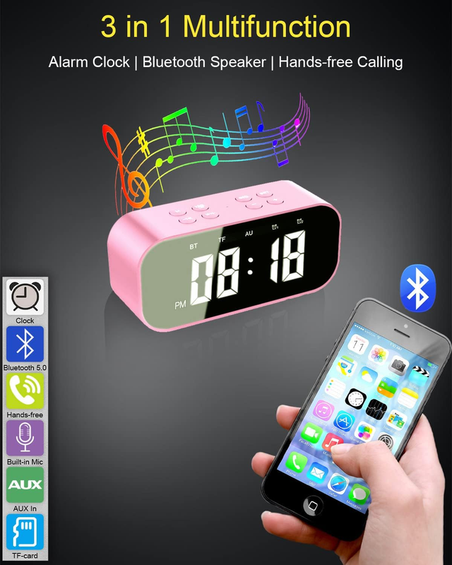 ?Multifunctional and Practical Design?-Bluetooth speaker + digital alarm clock + hands-free calling + mirror LED display.This table clock Bluetooth speaker is suitable for listening to audiobooks or party at night,watching movies,office video conferencing,cell phone calls.This digital clock for bedrooms is designed for modern life.