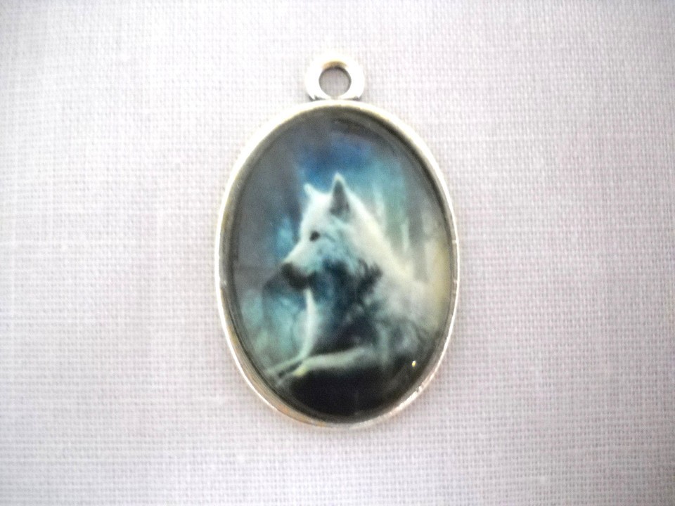 - ALASKAN NIGHT WHITE WOLF GLASS CABOCHON OVAL SHAPE ALLOY BASE PENDANT NECKLACE