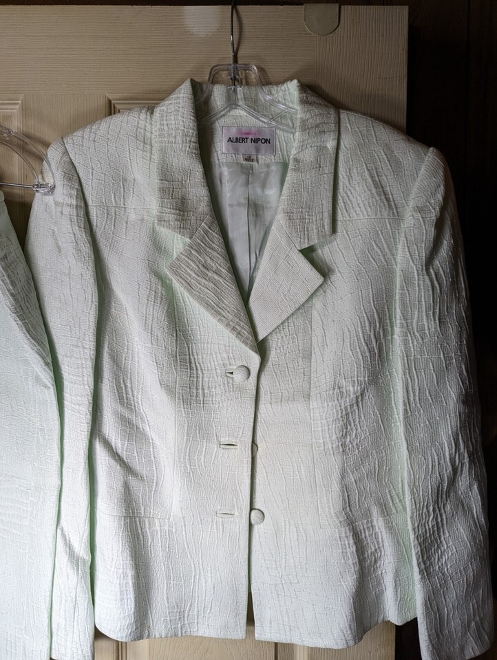 Ladies aqua size 12 skirt suit. Skirt appears to be knee length or just below the knees. Originally sold for $430.00