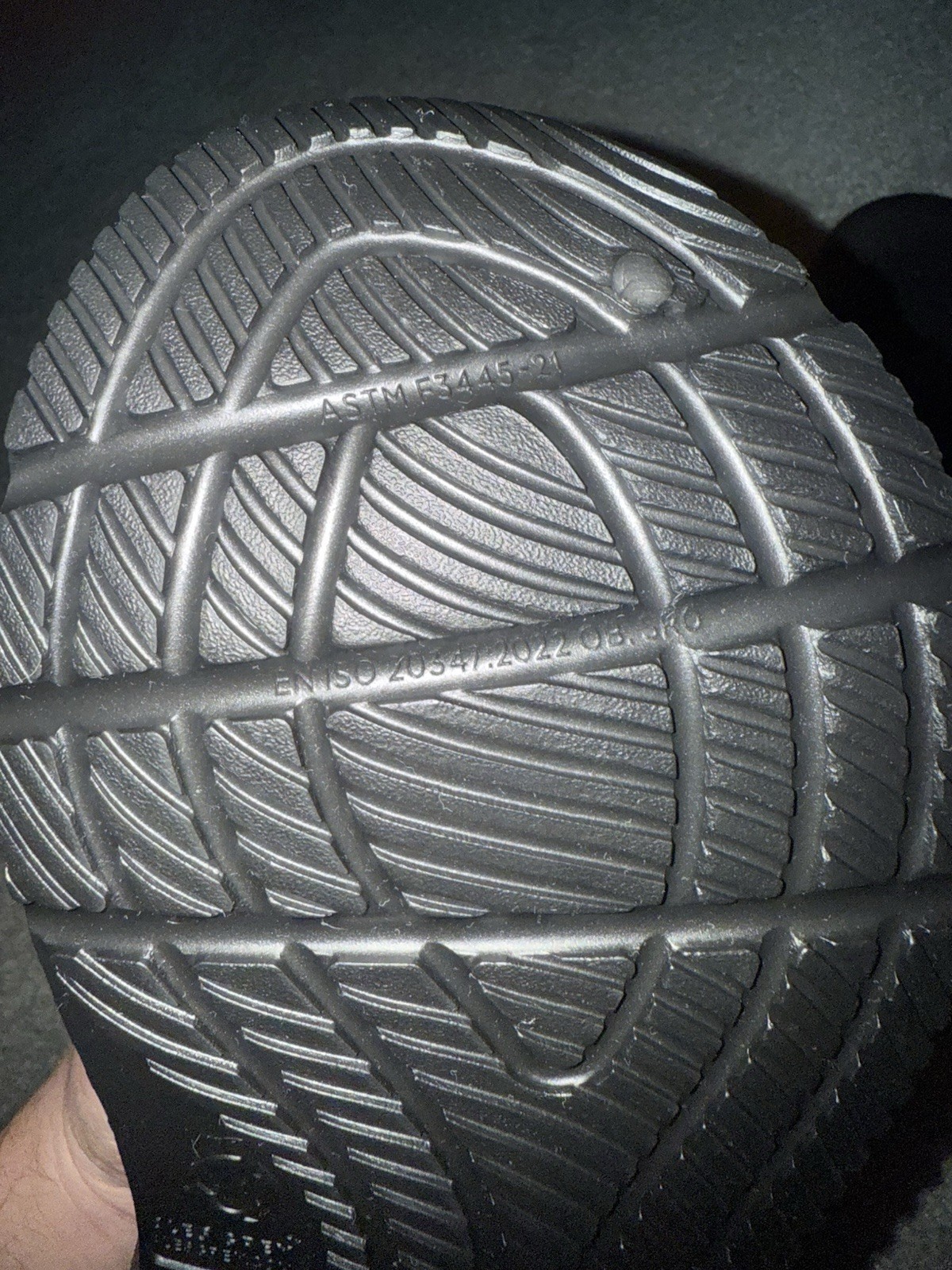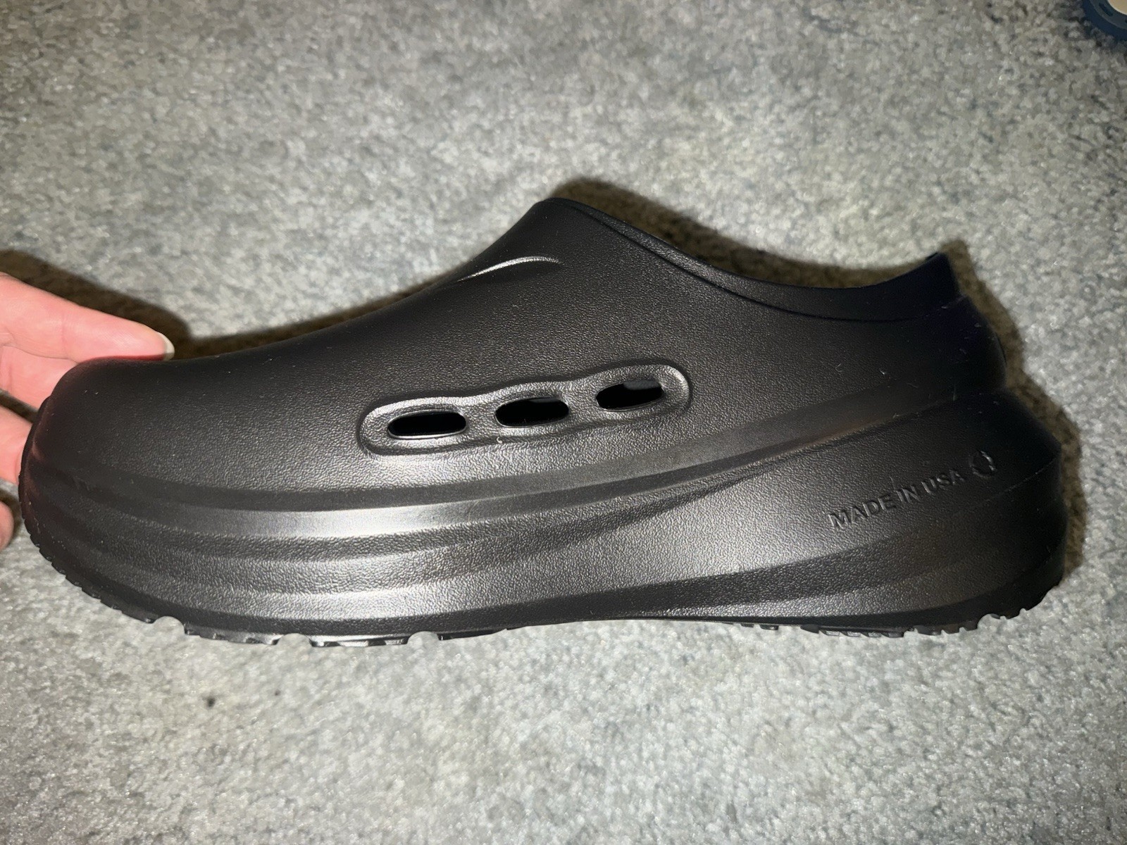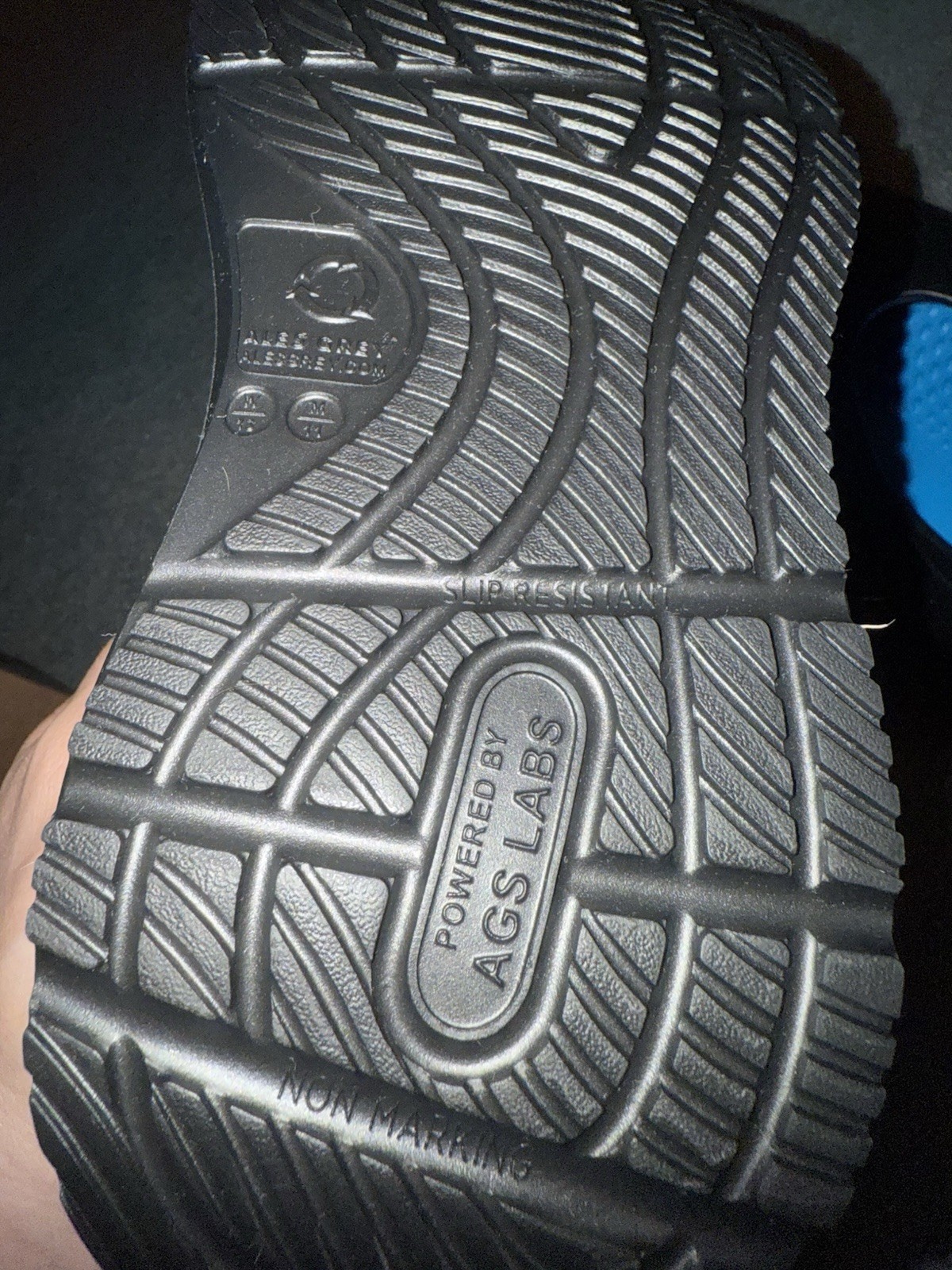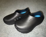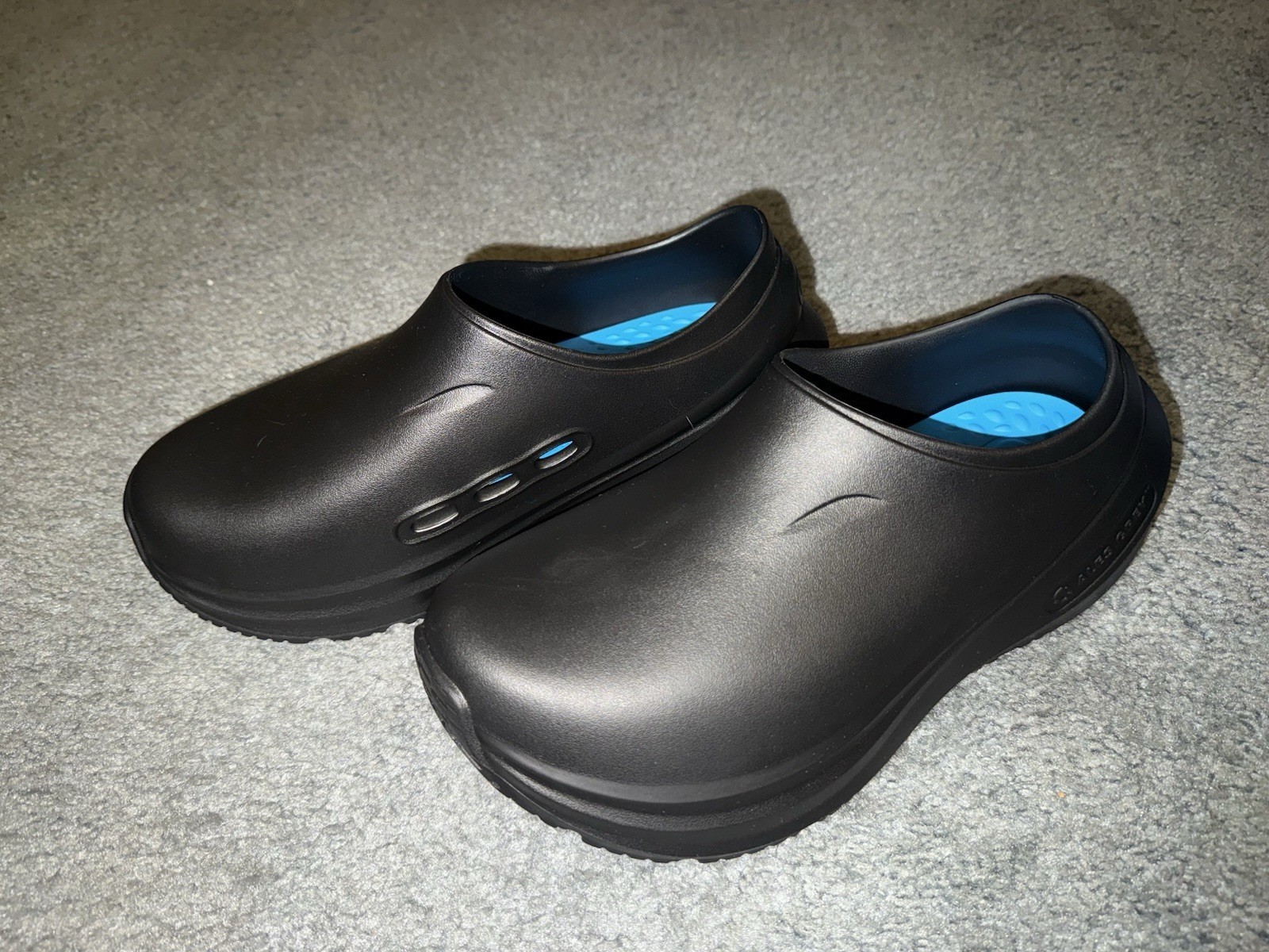 These are brand-new, in the original bag. They have removable insoles that are supposed to provide arch support and extra cushioning for standing a lot. They are also supposed to be slip-resistant and not mark up floors. Be warned though that the toe box curves up instead of extending straight out. You can see how the toes curl up in the picture.