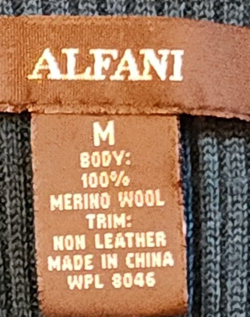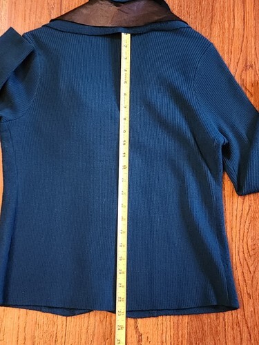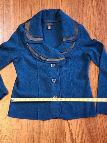 Beautiful Sweater, Alfani Merino Wool Ruffled Collar Button Cardigan Sweater in Sz Medium. 100% Merino Wool Dark Teal Blue, Ribbed sleeves, front and back alternating faux leather and wool layered collar with a slightly fitted button front. Great used condition