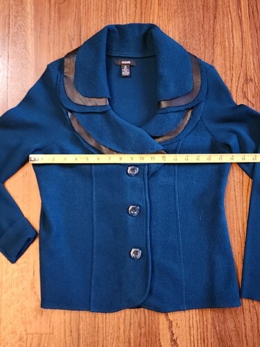 - Alfani Dark Teal Blue 100% Merino Wool Ruffle Collar Cardigan Sweater Med EUC