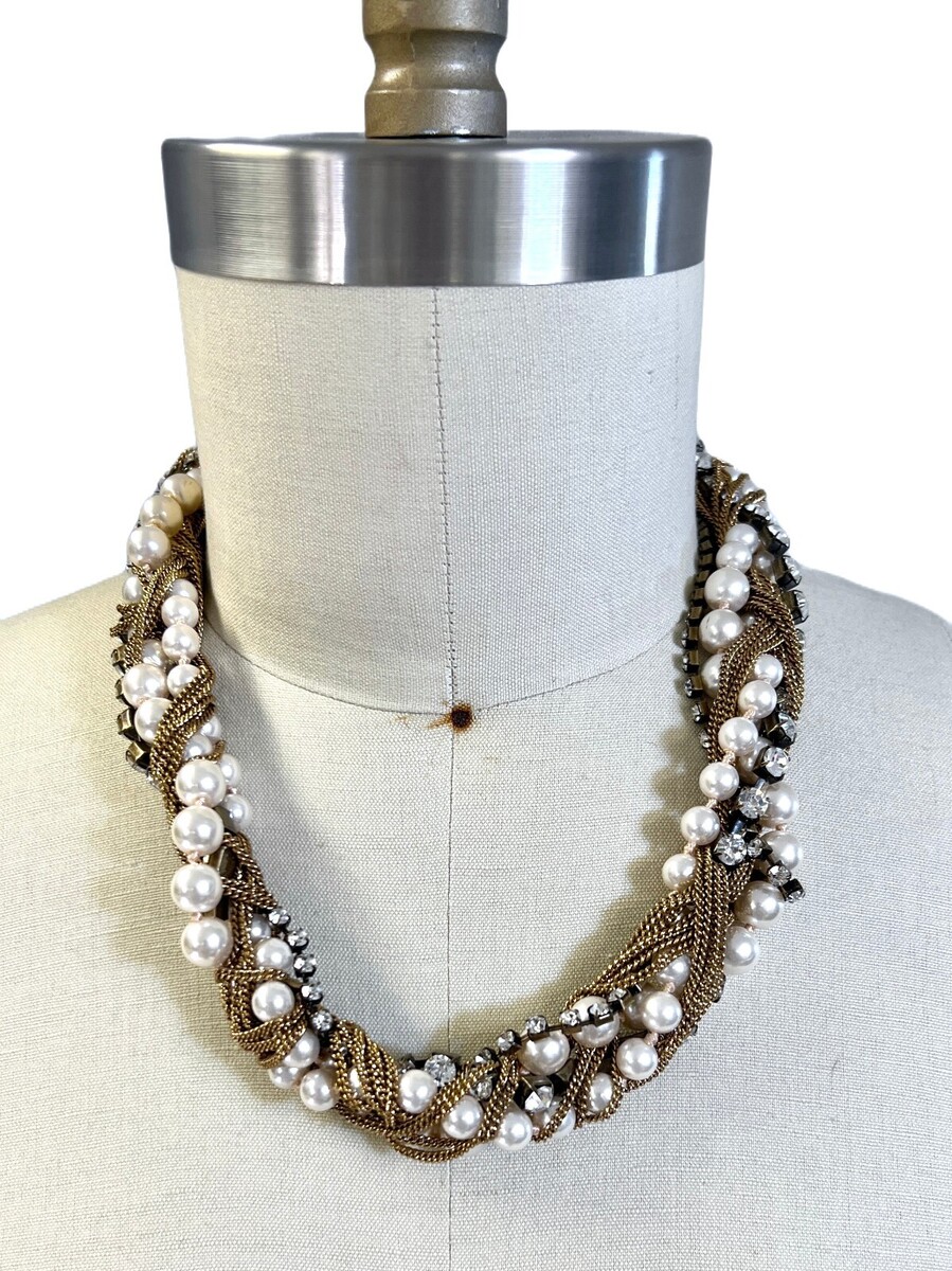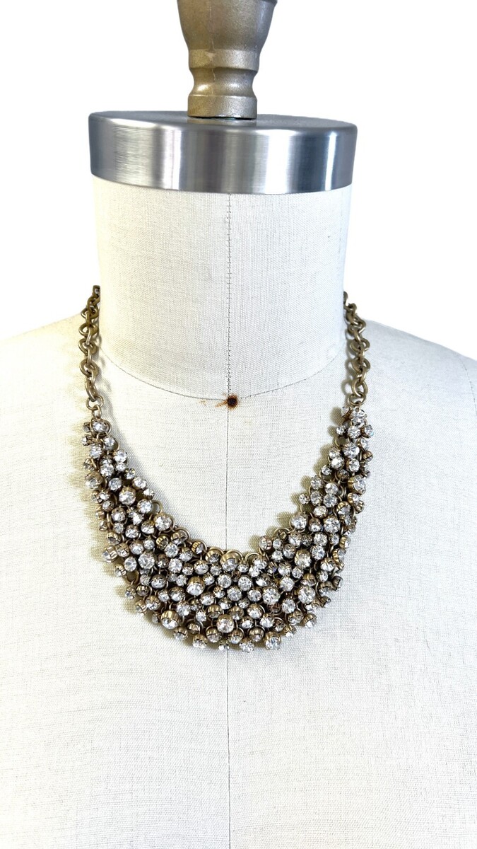 12 necklaces, all of varying styles, from delicate pale blue to stunning sparkly rhinestone and crystals to huge statement bib necklaces. All in great preowned condition. Some look vintage in style.