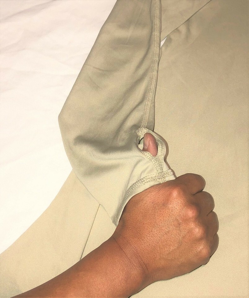 The Level I Undershirt has a crew neck, a contoured long tail in the back, and long sleeves with thumb holes to aid in donning multiple layers of clothing over the undergarment.