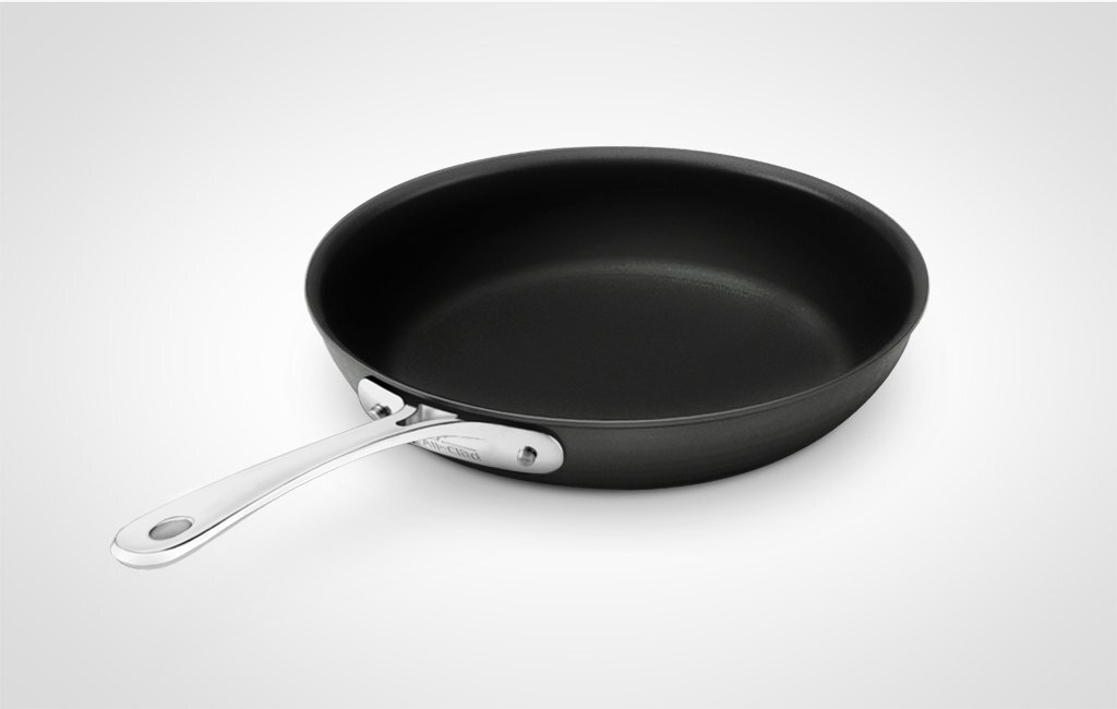 Product description: All-Clad B3 Hard Anodized Nonstick Fry Pans Set will have you cooking like a pro in the kitchen in no time Heavy gauge, hard anodized aluminum construction ensures rapid, even heating and lasting use Superior nonstick cooking surface for easy food release and cleanups Induction-bonded base ensures compatibility with induction ranges Double-riveted stay-cool handle for secure and safe handling Pans are ideal for searing, browning and pan frying everything from eggs to meats Flat bottom and flared sides make tossing foods effortless and allows for easy turning with a spatula Durable, stainless steel, induction-bonded base prevents cookware from warping and protects stovetops from scratching Great for cooking at high heat with oils to develop foods with full, rich flavor, color and crisp texture Includes 8" open fry pan