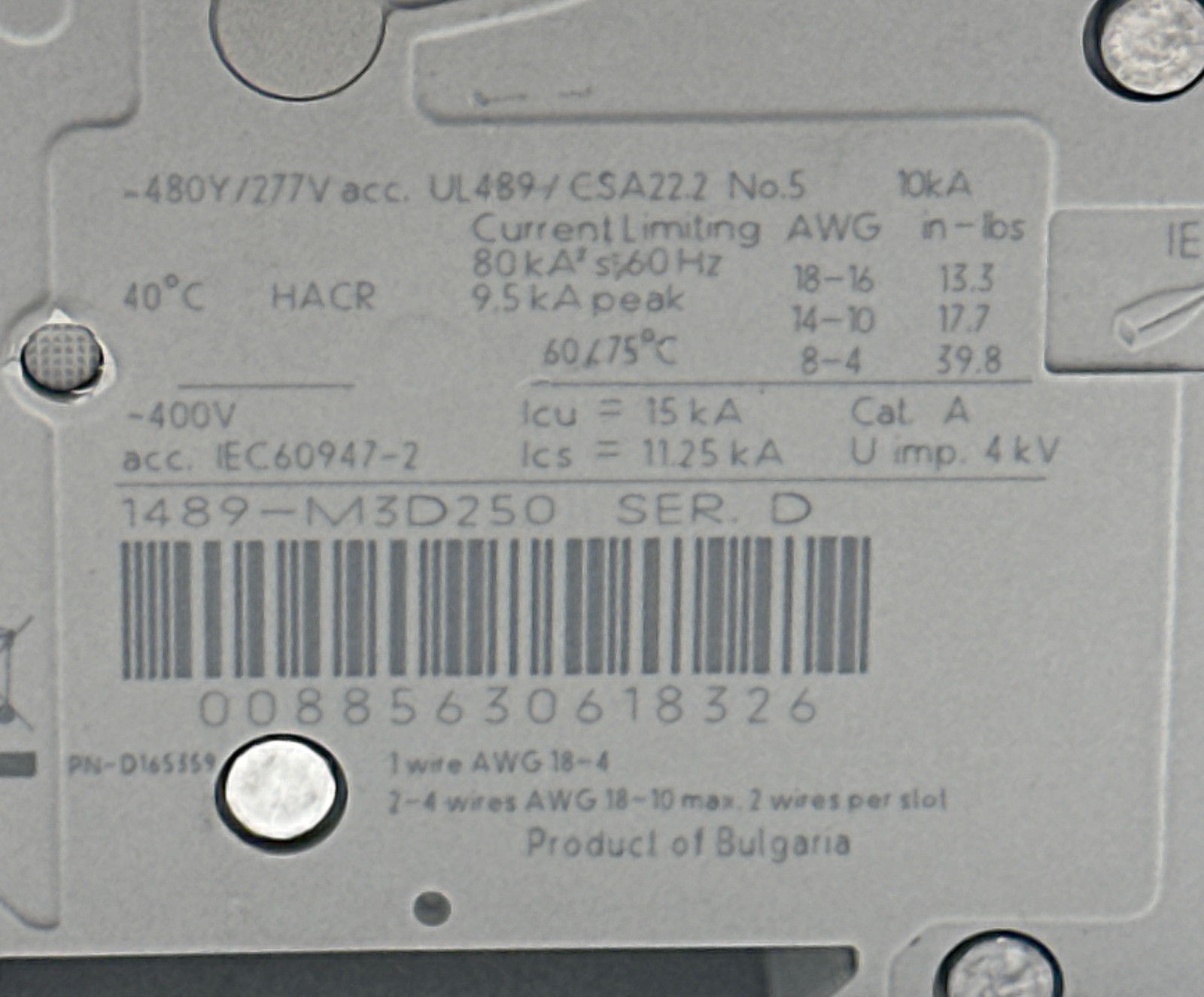 - Allen-Bradley 1489-M3D250 SER.D 3-Pole Circuit Breaker, 480Y/277V 25A