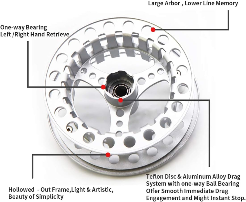 Large Arbor Design -- Featuring a large arbor design, this reel allows for quick spool release and effortless switching between left and right-hand retrieval. This design not only facilitates fast fly line retrieval but also significantly reduces line memory, making your fishing experience smoother and more efficient.