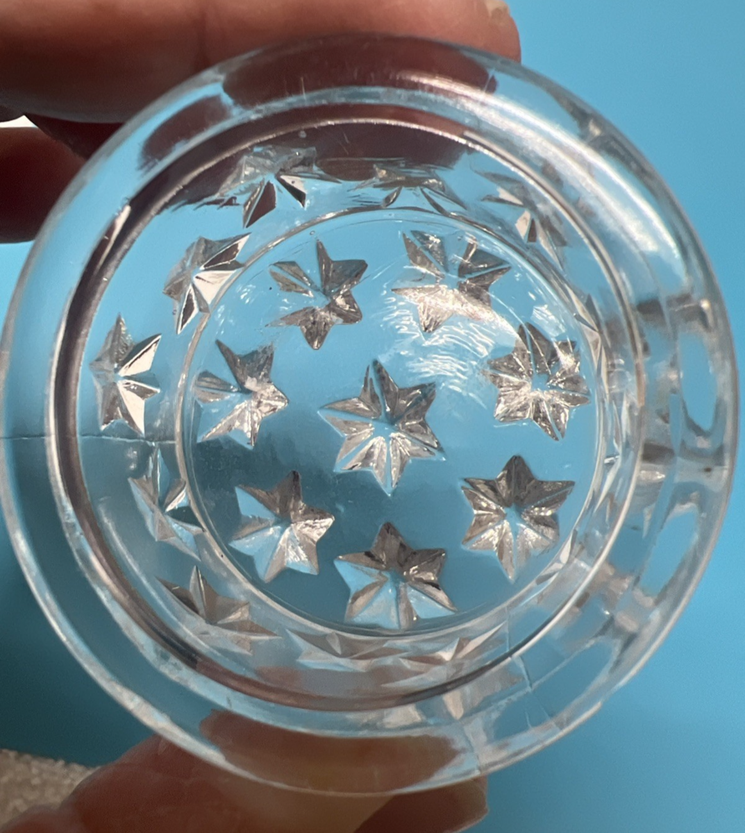 Amazing Raised Star Clear Glass Open Salt Dip 1 7/8 x 7/8 inch Flake There is a tiny flake on the edge of the rim the stars are great!
