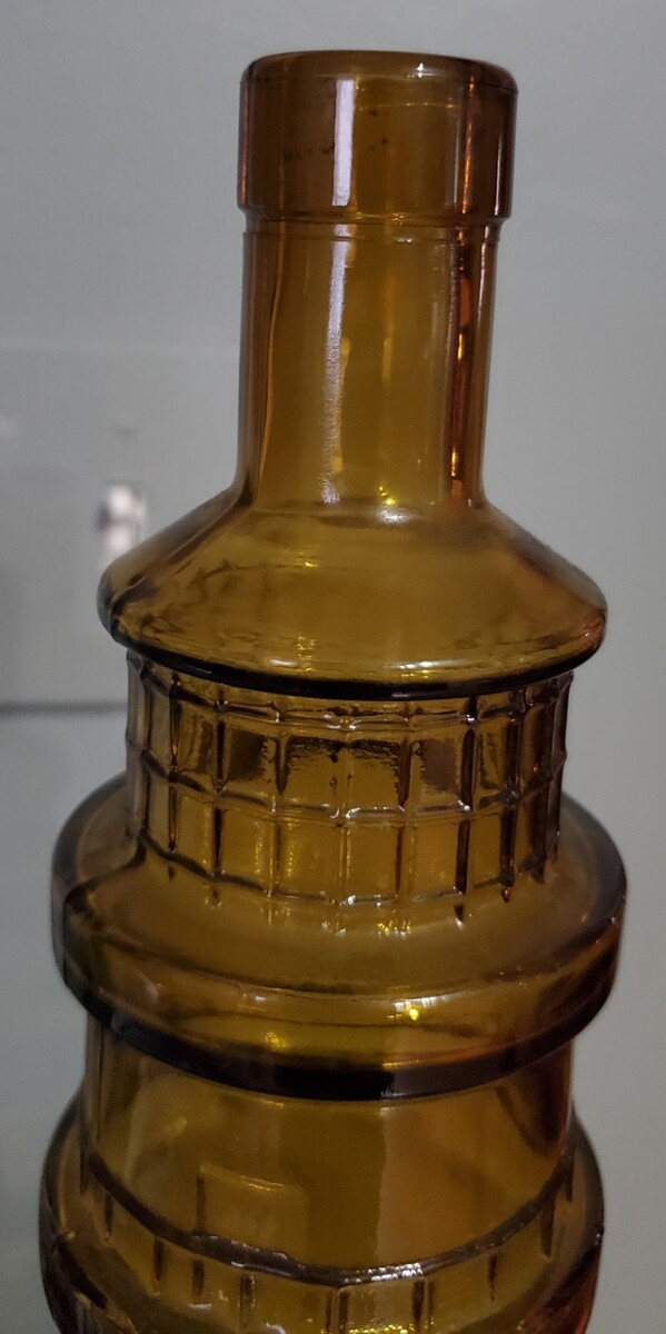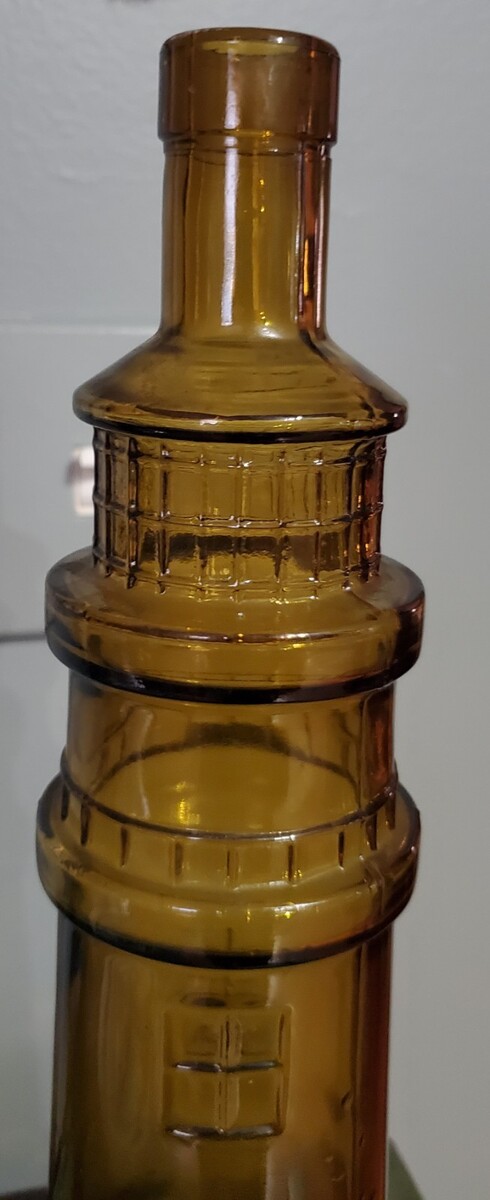 Beautiful Amber Lighthouse Wine Bottle. This measures approx 13" and has no cracks or chips. Great decorative piece.