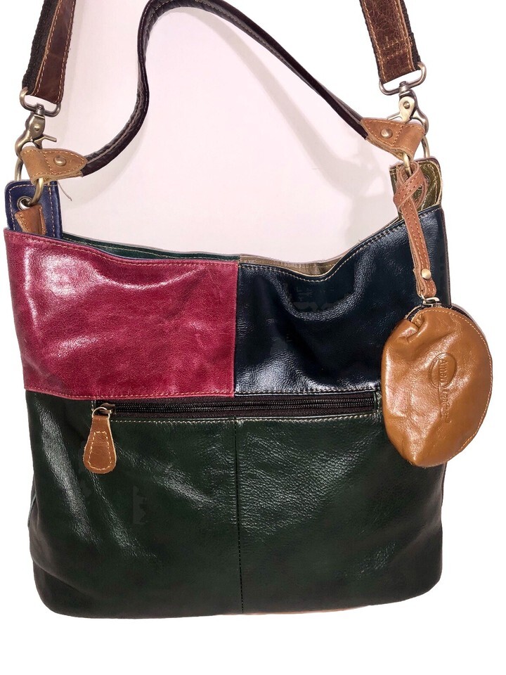 This Ameri Leather tote shoulder purse features a colorful patchwork design with colorful woven design on the front near the bottom with buckle and strap accents. The bag is a medium-sized hobo style with a zip closure and gold hardware. It includes inner pockets, double leather handles, and a detachable crossbody strap. The exterior is made of leather with a fabric lining in beige. Ideal for travel, parties, work, or casual wear, this bag exudes a hippie and cowgirl style. Accessories include a coin purse.