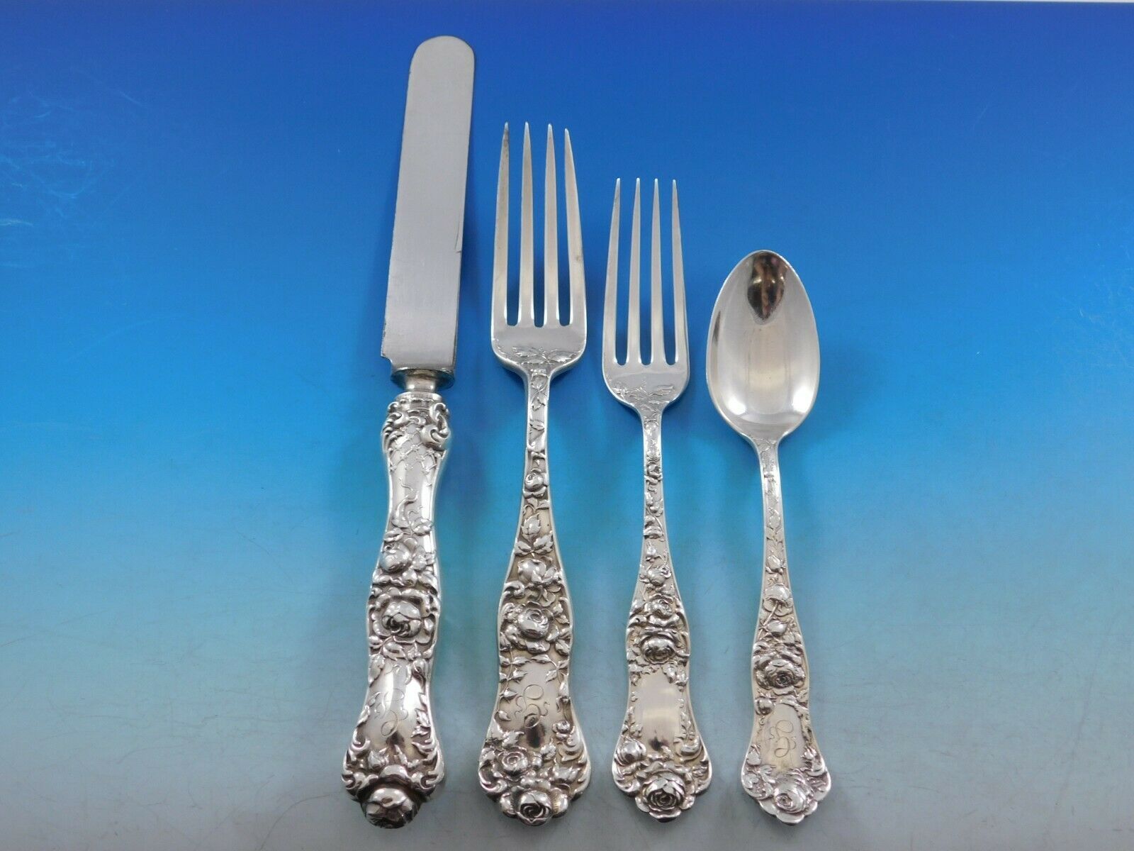 Superb American Beauty by Shiebler/Mauser Sterling Silver Flatware set with rose motif - 87 pieces. This set includes: