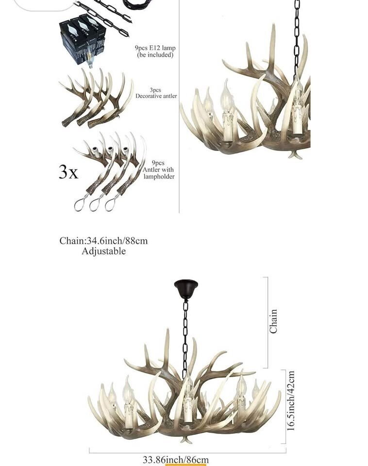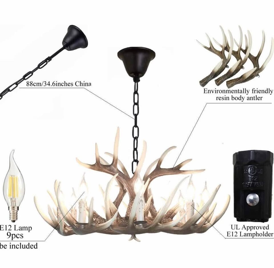 American Deer Horn Chandelier, 9 Lights + 3 Heads, Vintage Style, Resin Horning Lamp for Home, Bar, Cafe, Shop, Retro Deer Horn Light with UL Approved E12 Lampholder