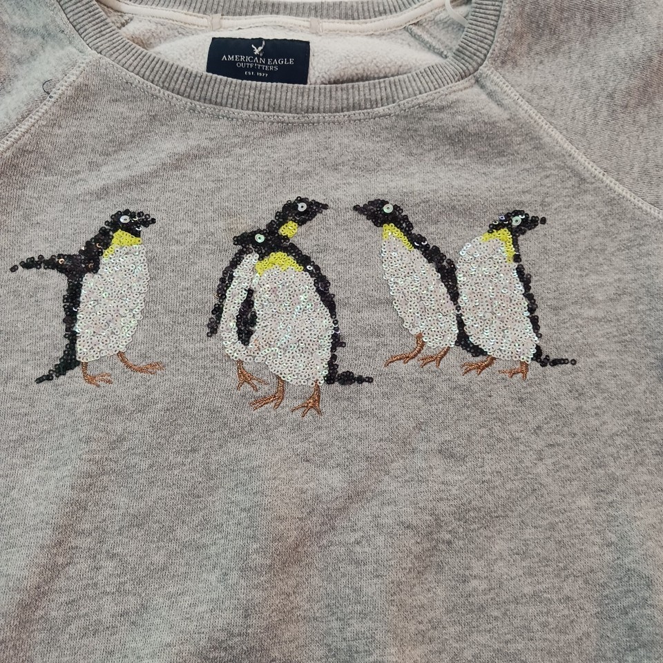 This American Eagle Outfitters women's sweater is a stylish addition to your wardrobe. The gray color and solid pattern make it a versatile piece that can be dressed up or down. The sweater has a round neckline, long sleeves, and a pullover style.