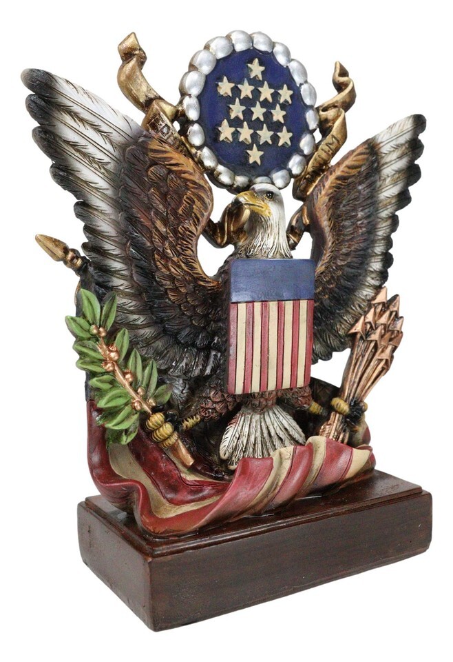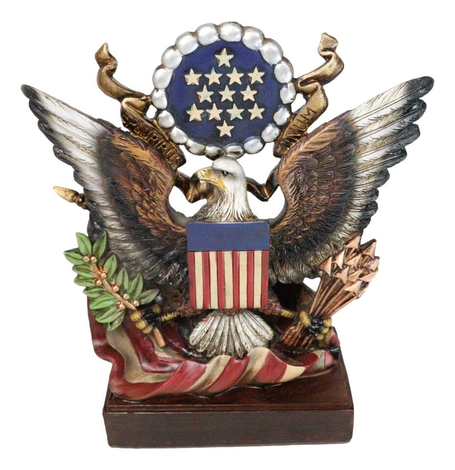? Showcase your patriotism and add a touch of American pride to your workspace with this beautifully crafted American Great Seal Bald Eagle Desktop Plaque. Featuring the iconic eagle clutching an olive branch and arrows, symbolizing peace and strength, it proudly displays the words "E Pluribus Unum" as a reminder of unity. Made with exquisite attention to detail, this plaque is the perfect addition to any office, home, or collection, making a statement of timeless American values.